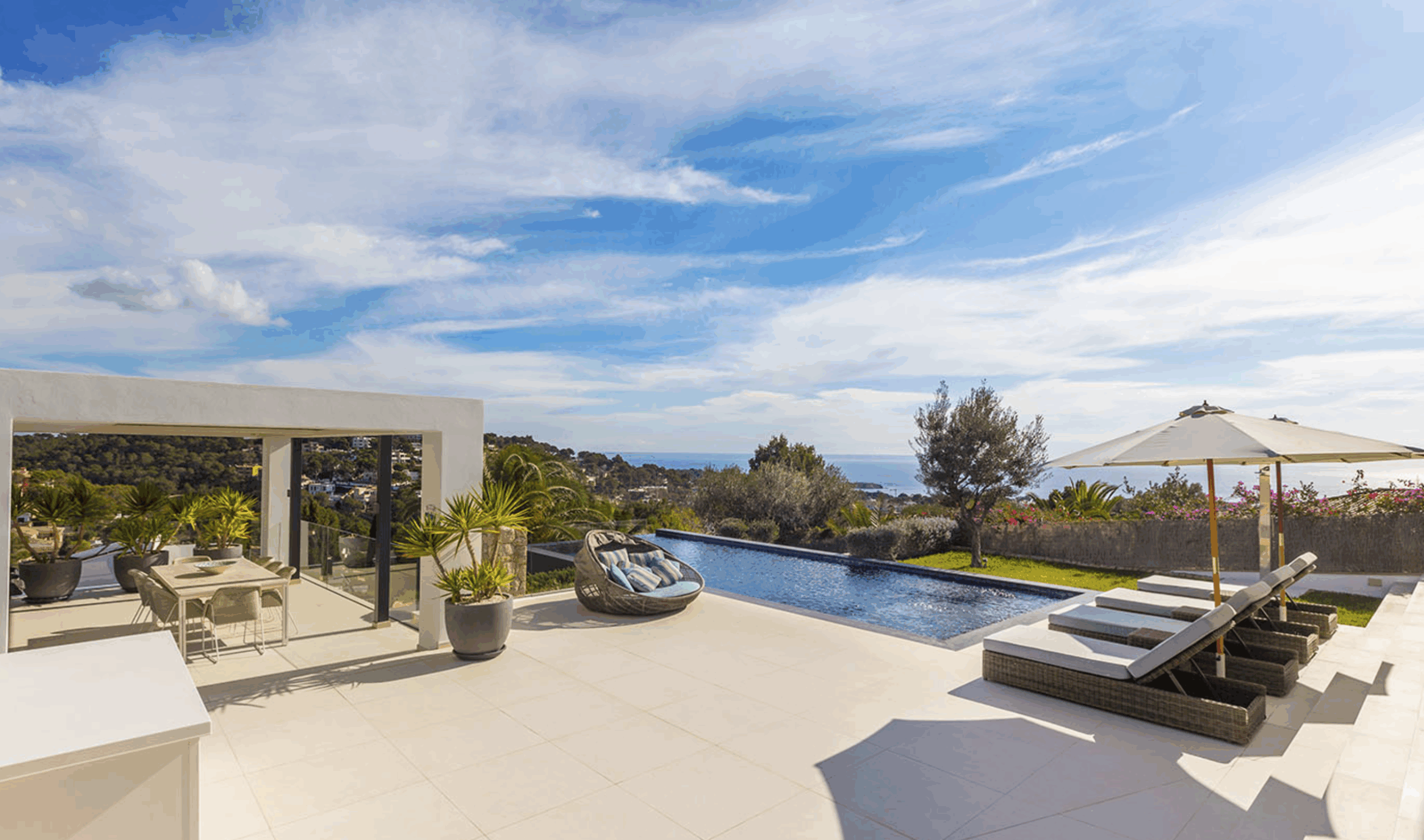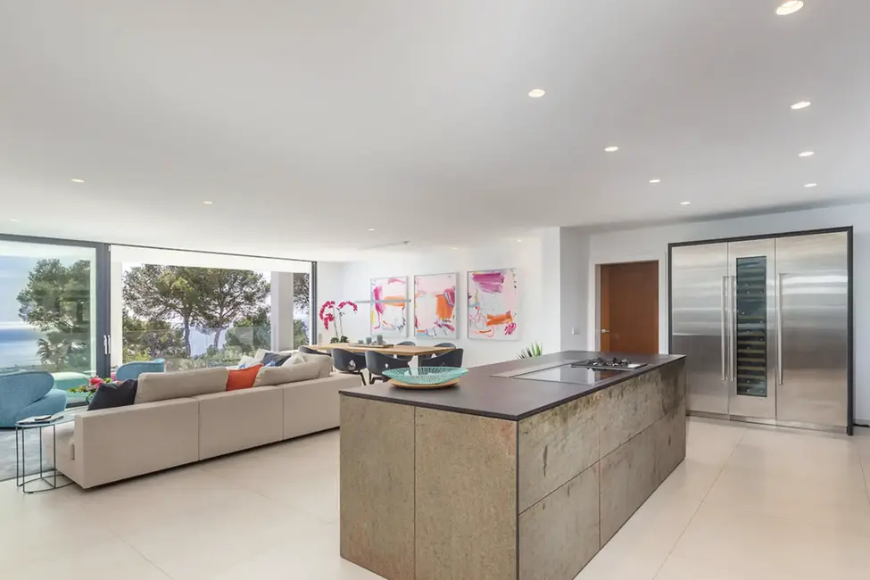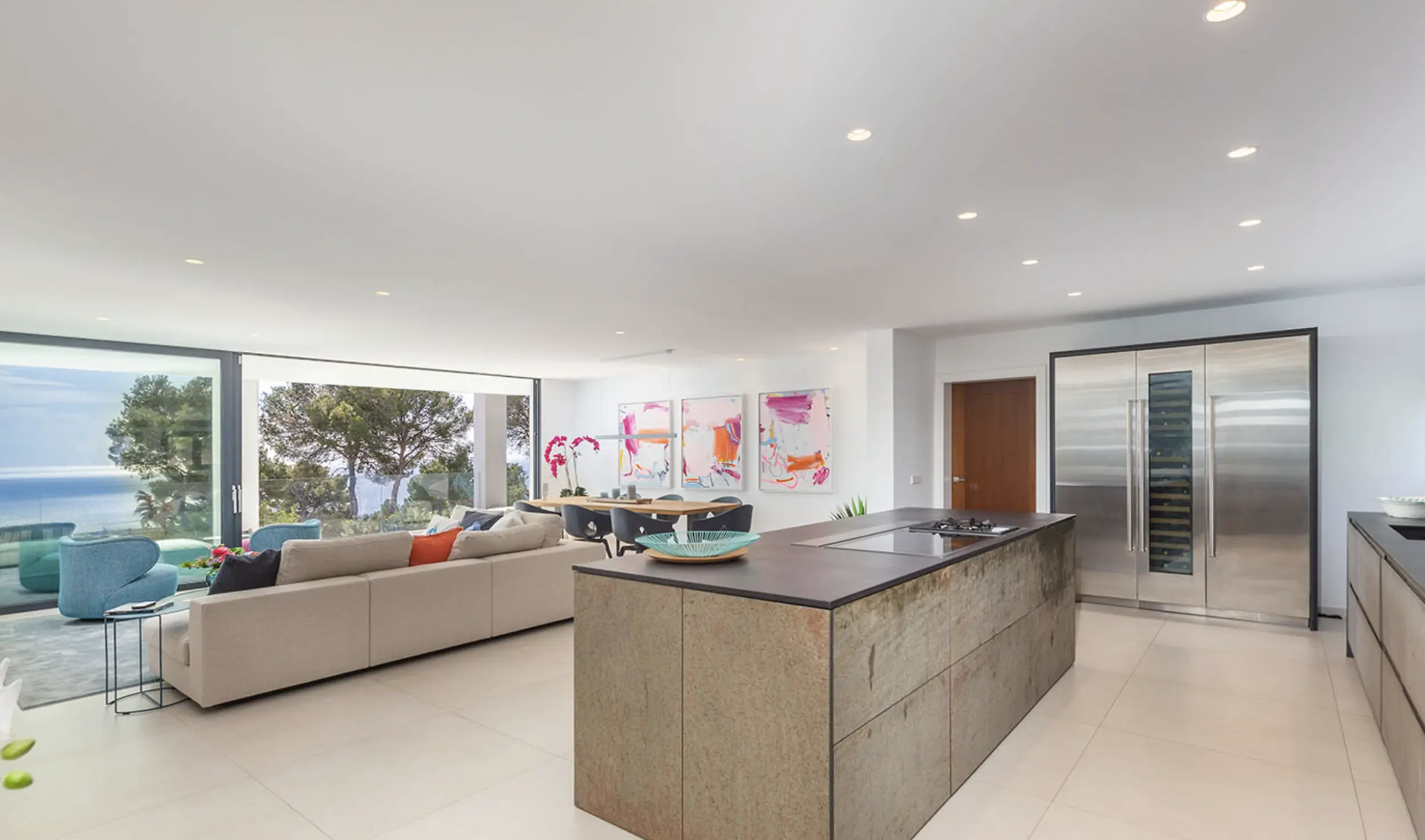Der Hauptwohnbereich mit offener Küche befindet sich in der oberen Eingangsebene und führt auf eine großzügige Terrasse mit Ess- und Loungebereichen. Der beeindruckende Außenbereich mit Infinity-Pool, Sommerküche und Pool-Haus garantiert höchsten Wohnkomfort und mediterranes Flair.