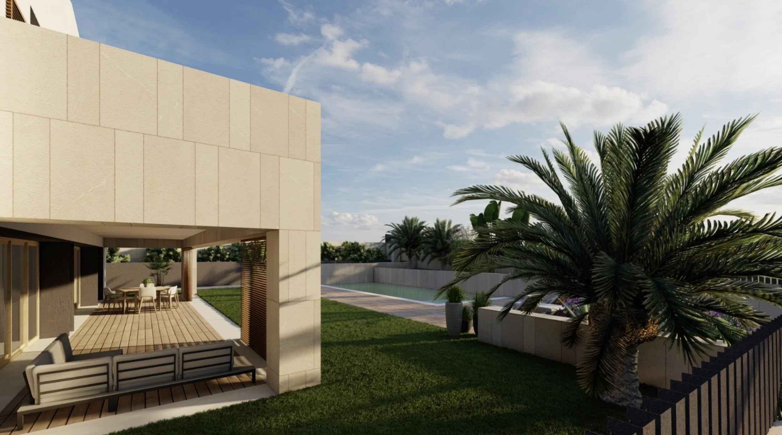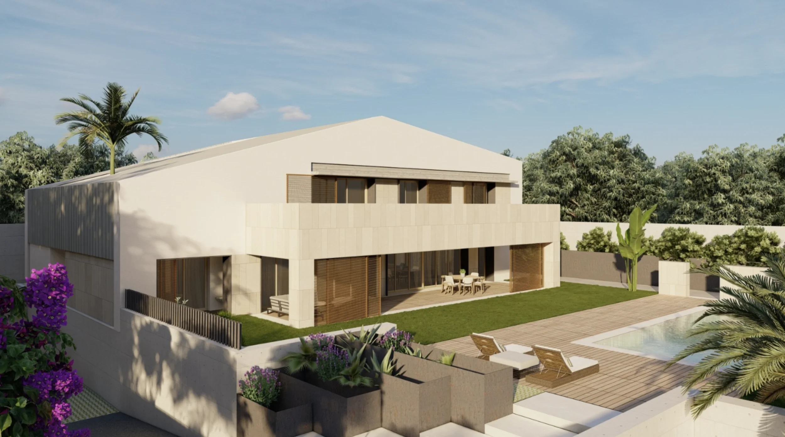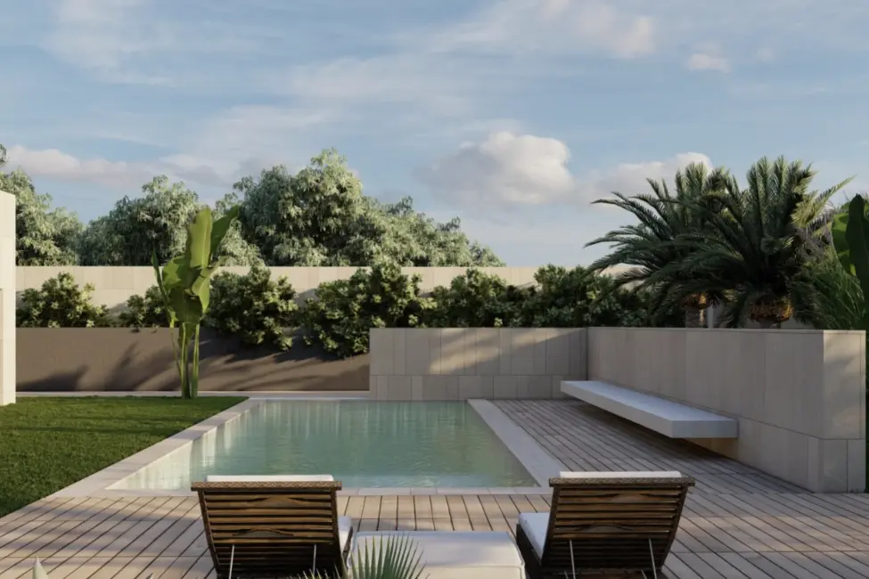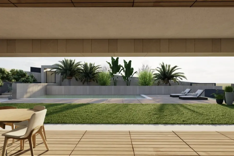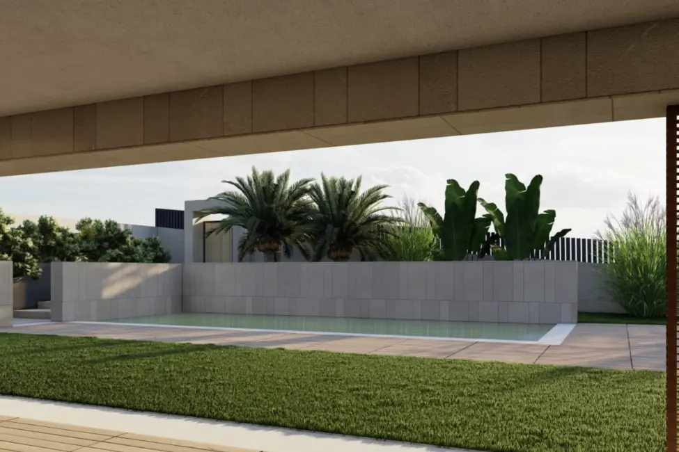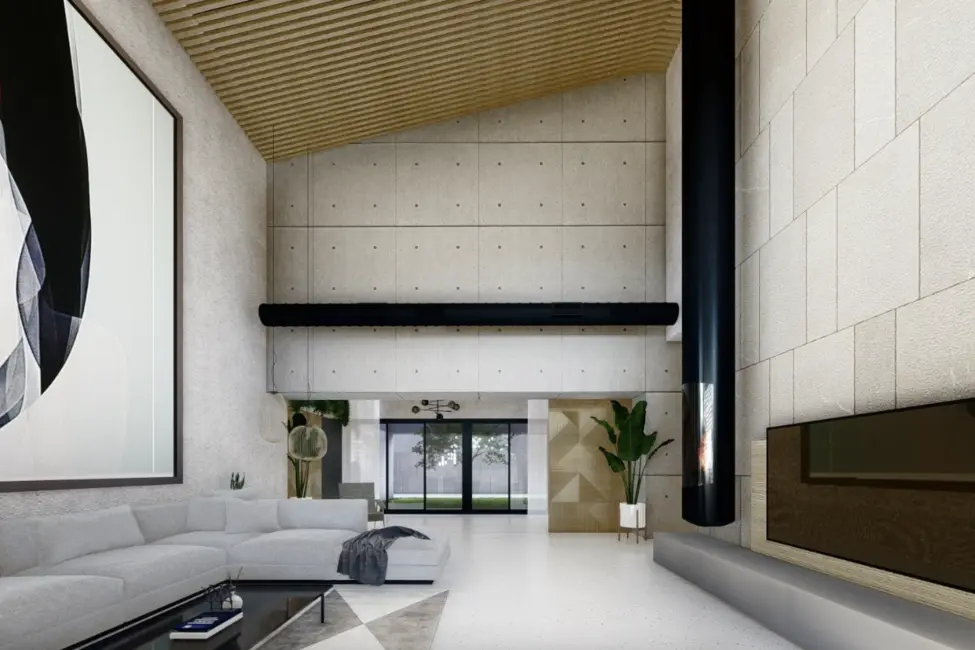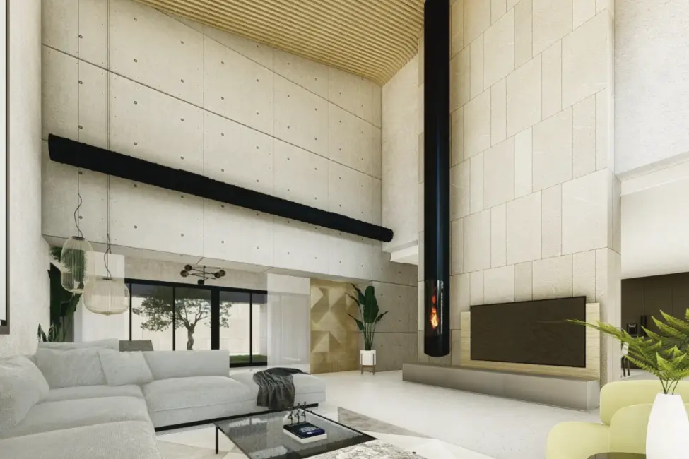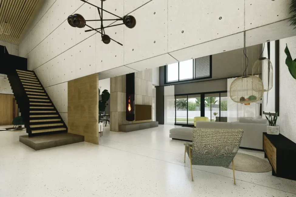 Geplant ist ein modernes, lichtdurchflutetes Zuhause mit doppelt hohen Decken, großzügigen Fensterfronten und fließenden Übergängen zwischen Innen- und Außenbereichen. Der Wohnraum öffnet sich zum Garten und zum vorgesehenen Poolbereich und schafft ideale Voraussetzungen für ein entspanntes Familienleben sowie gesellige Stunden mit Freunden.
