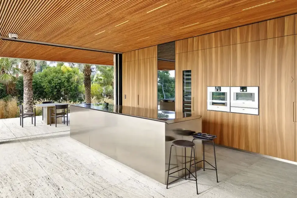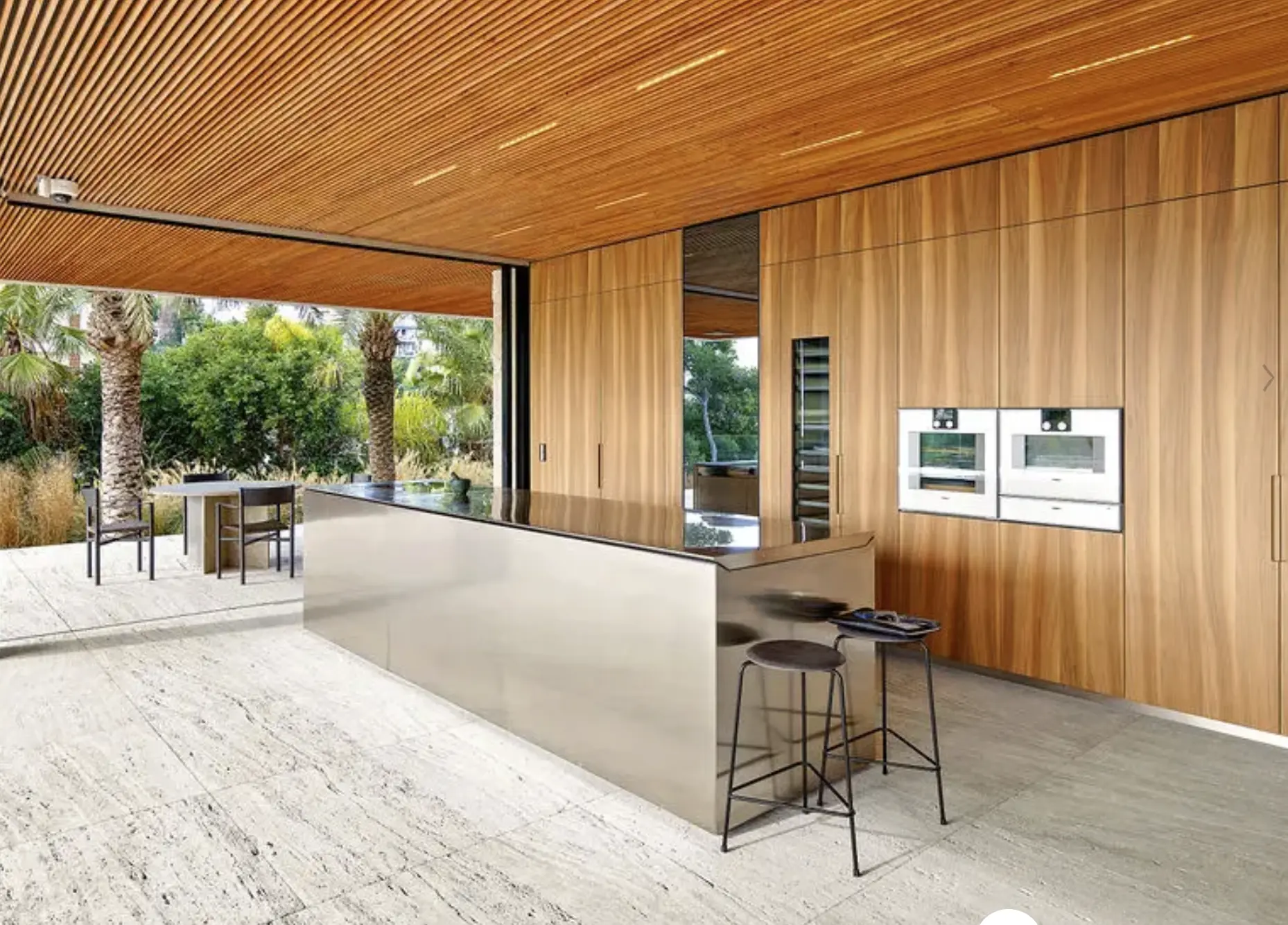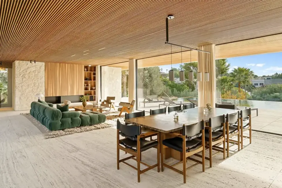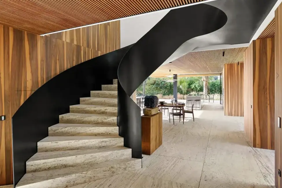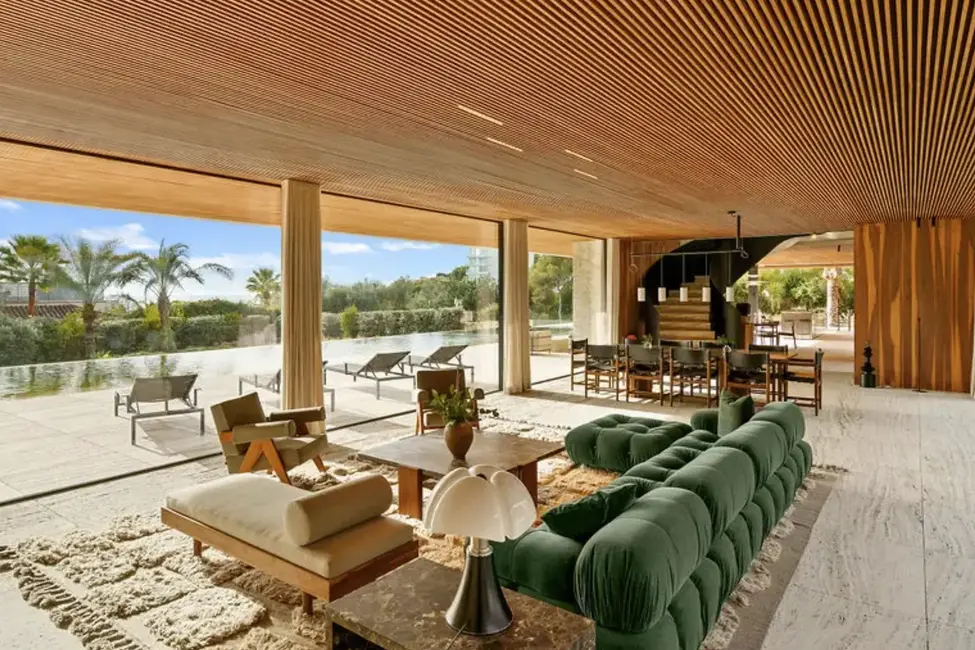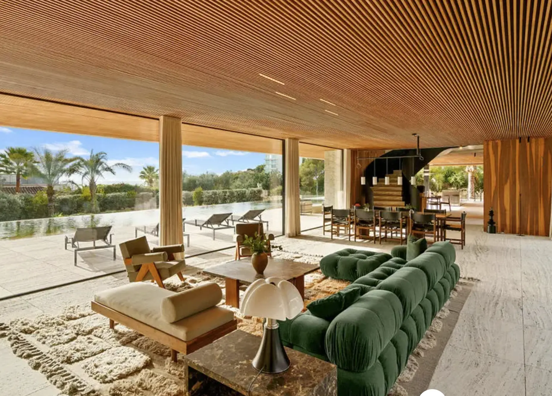 Beim Betreten der Villa wird der Blick sofort auf die spektakuläre, geschwungene Treppe gelenkt, die als architektonisches Highlight den eleganten Charakter des Hauses unterstreicht. Das Herzstück der Villa bildet die große Boffi-Küche, ausgestattet mit hochwertigen Gaggenau-Geräten. Die Küche öffnet sich nahtlos zu den großzügigen Wohn- und Essbereichen, die durch große Fensterflächen lichtdurchflutet sind und den Innen- und Außenbereich miteinander verschmelzen lassen.