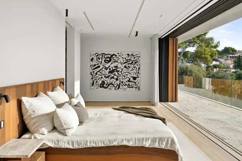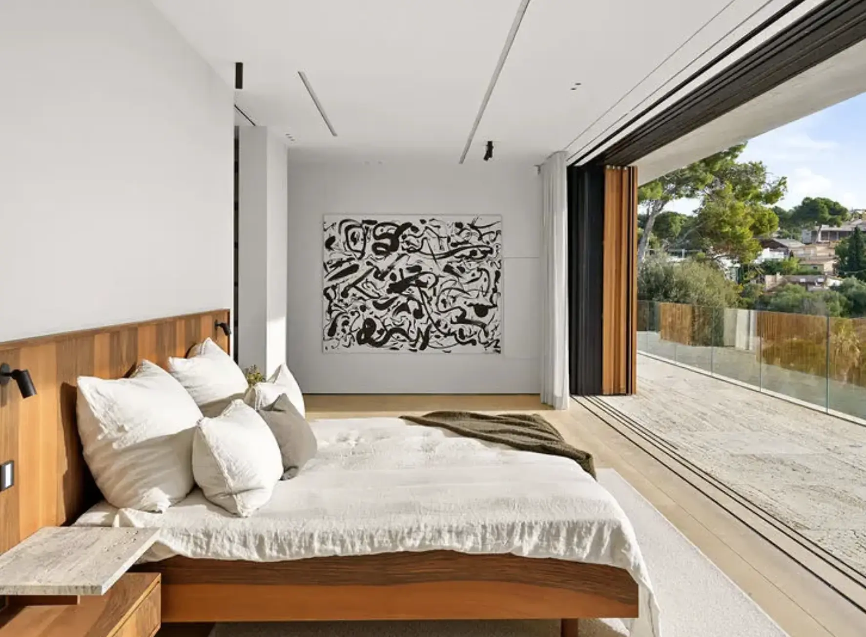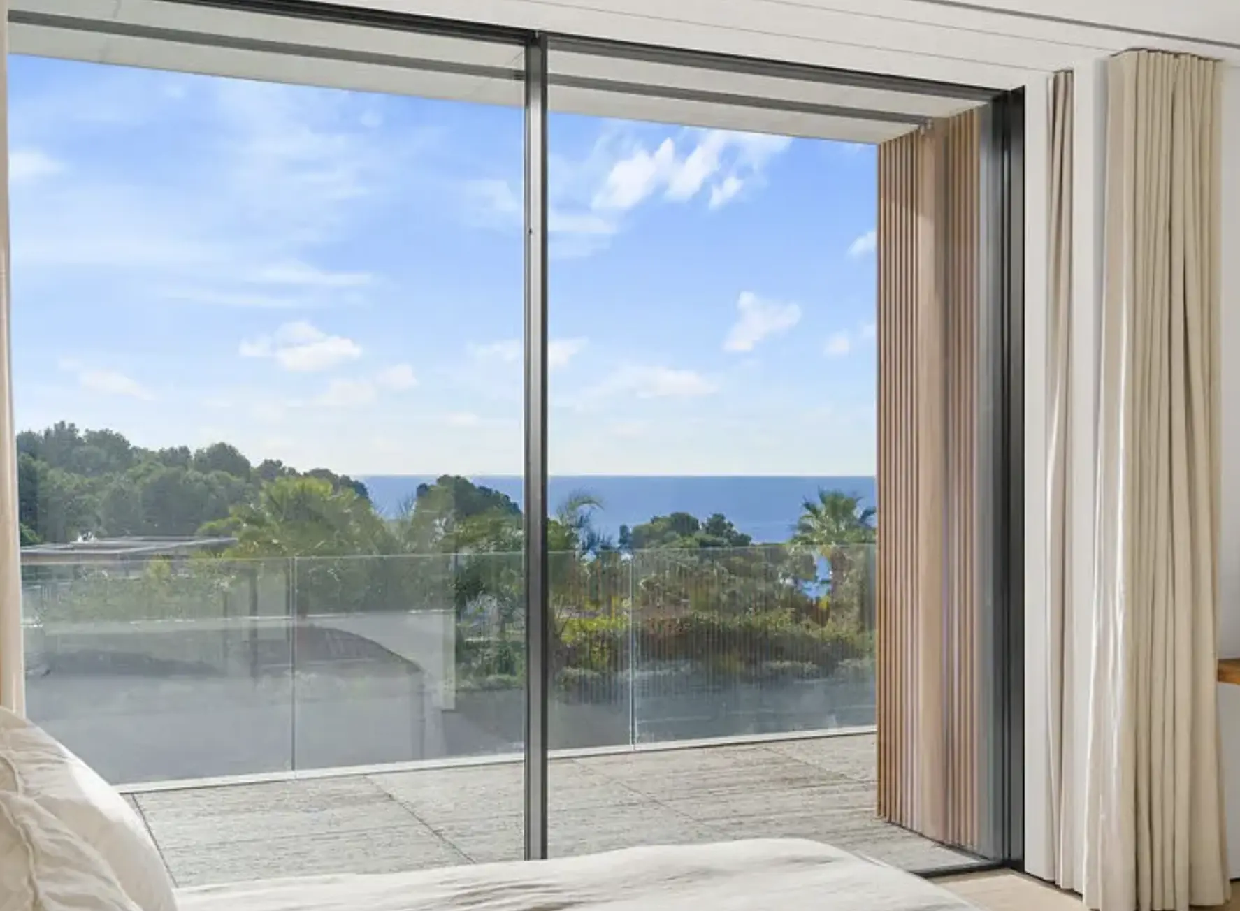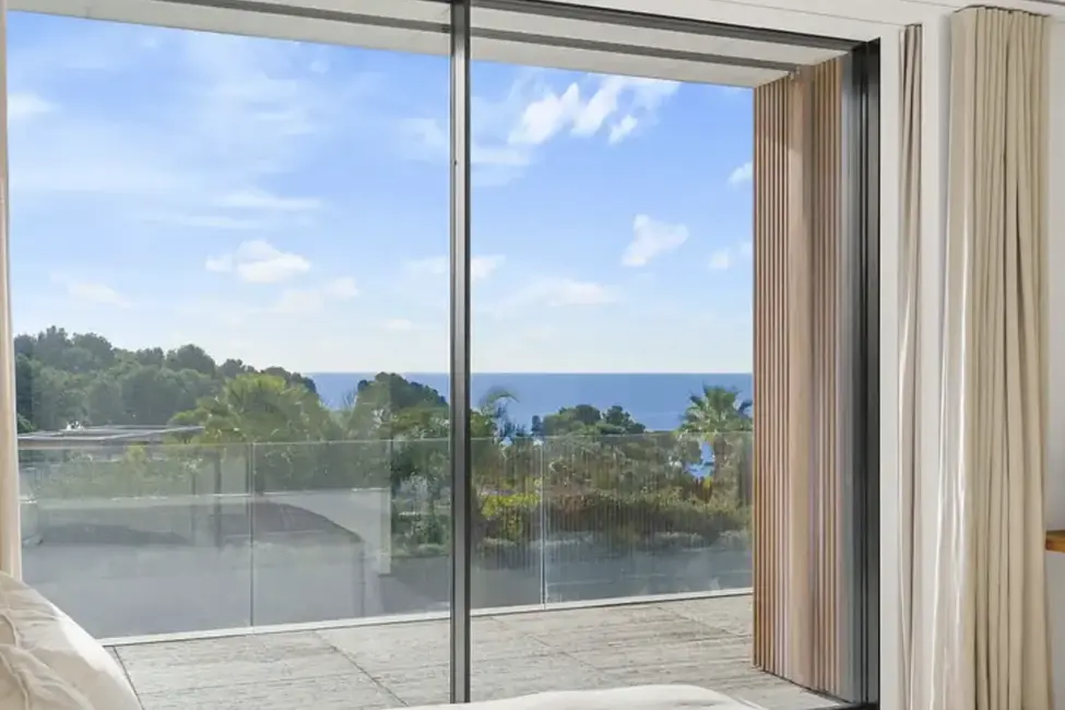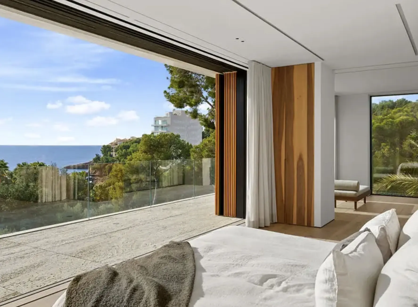 Im Obergeschoss befinden sich die Schlafbereiche, angeführt von der großzügigen Master-Suite, die etwa 80 m² umfasst. Diese luxuriöse Suite verfügt über ein elegantes Badezimmer, einen großzügigen Ankleidebereich, ein Yoga-Zimmer und eine weitläufige Sonnenterrasse mit atemberaubendem Blick. Drei weitere Schlafzimmer, jeweils mit eigenem Bad, bieten zusätzlichen Komfort und Privatsphäre. Ein großer TV- oder Heimkinoraum lädt zu entspannten Abenden ein. Jedes Zimmer auf dieser Ebene bietet einen beeindruckenden Meerblick und direkten Zugang zur Terrasse.