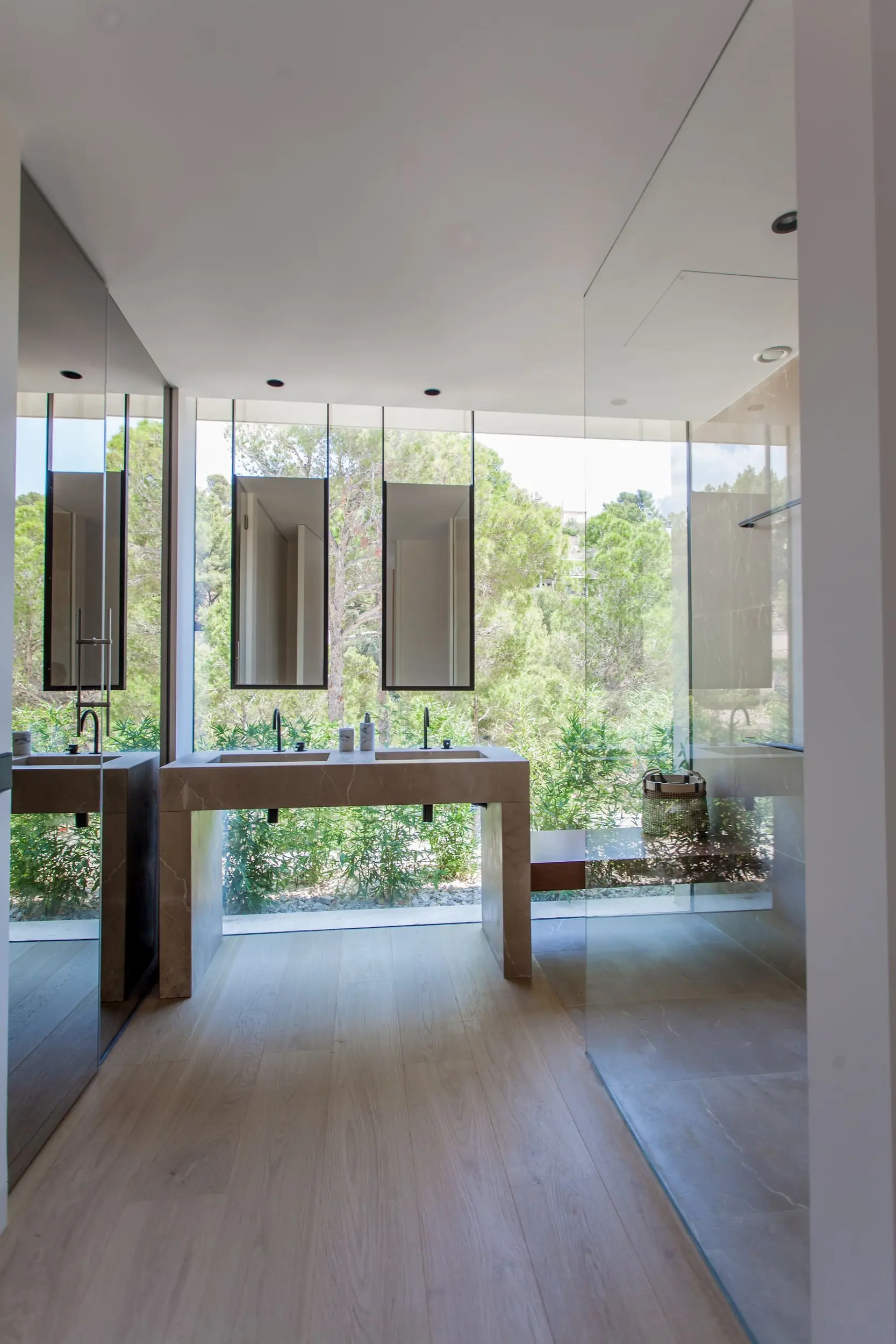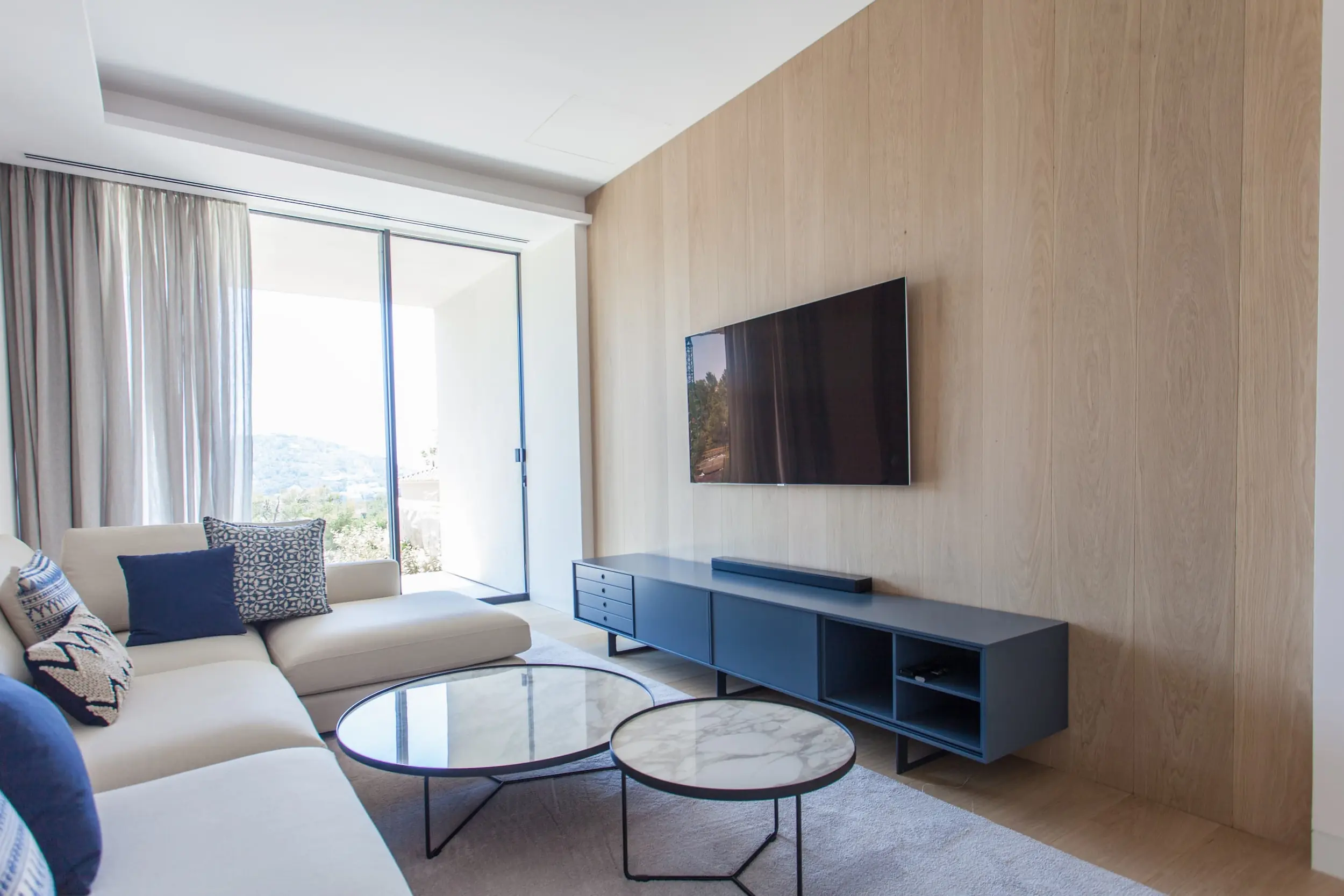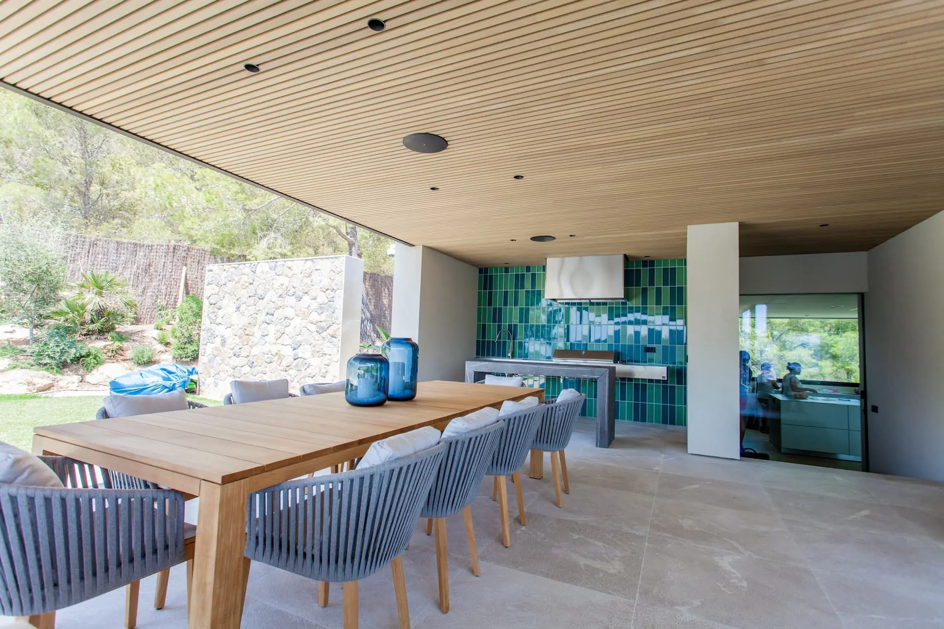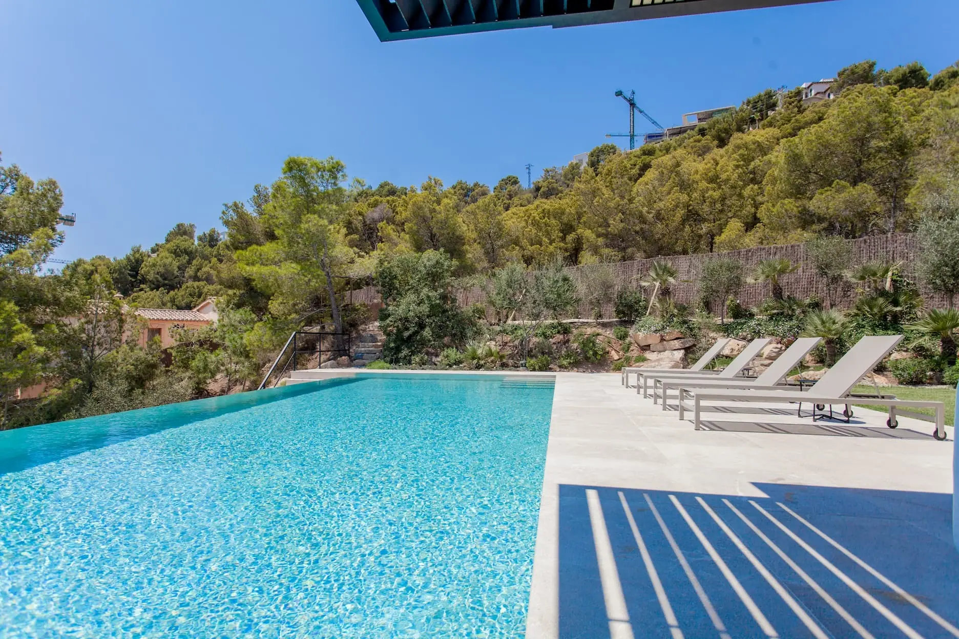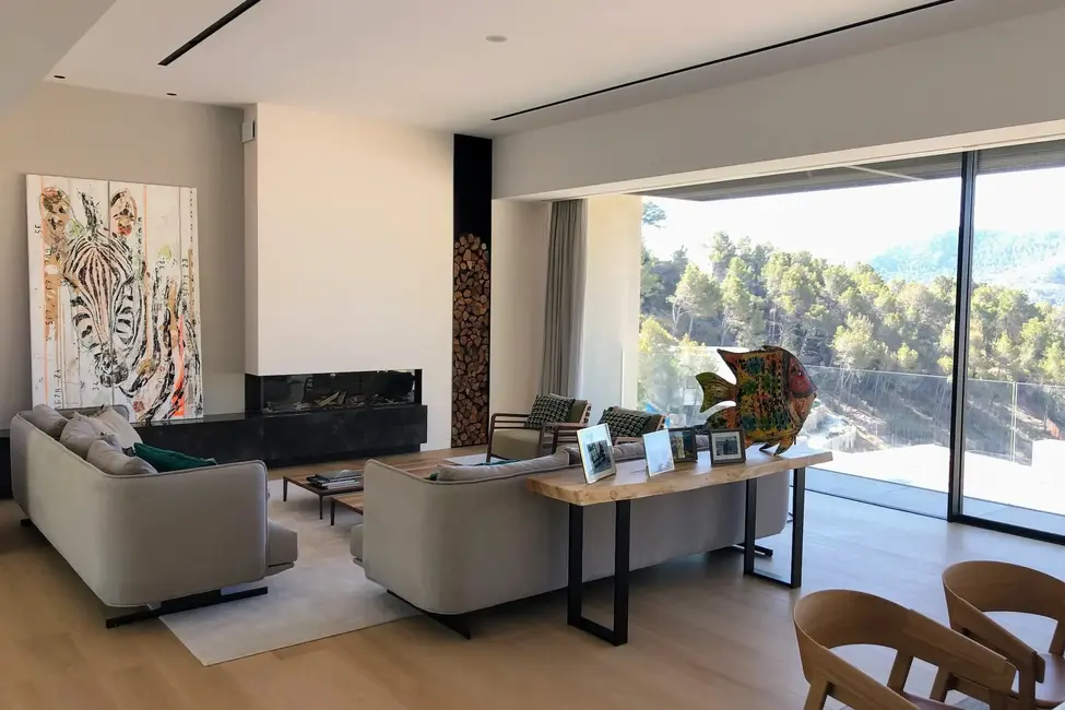Der offene Grundriss verbindet Innen- und Außenbereiche mühelos. Große Fenster und Glasschiebetüren lassen reichlich natürliches Licht in die Räume und bieten gleichzeitig einen nahtlosen Zugang zur weitläufigen überdachten Terrasse mit angrenzender flacher Rasenzone. Hier können Sie sich in der mediterranen Sonne sonnen, am Infinity-Pool entspannen oder im Freien speisen, während Sie die spektakuläre Aussicht genießen. Die angrenzende Grünzone verleiht dem Haus zusätzliche Privatsphäre und Ruhe.