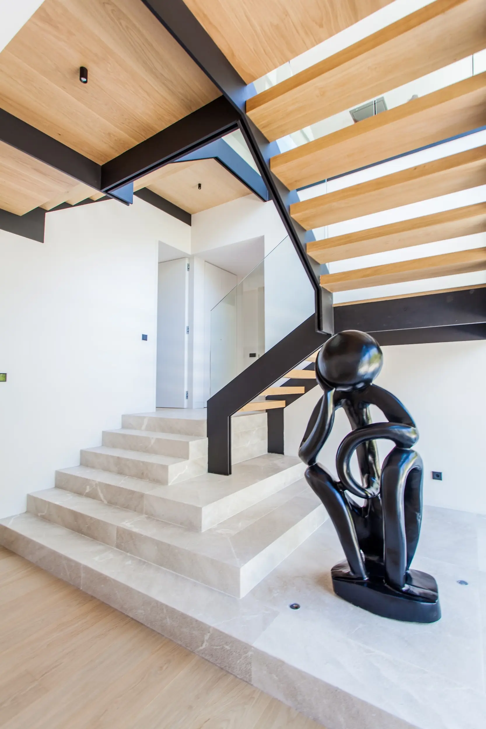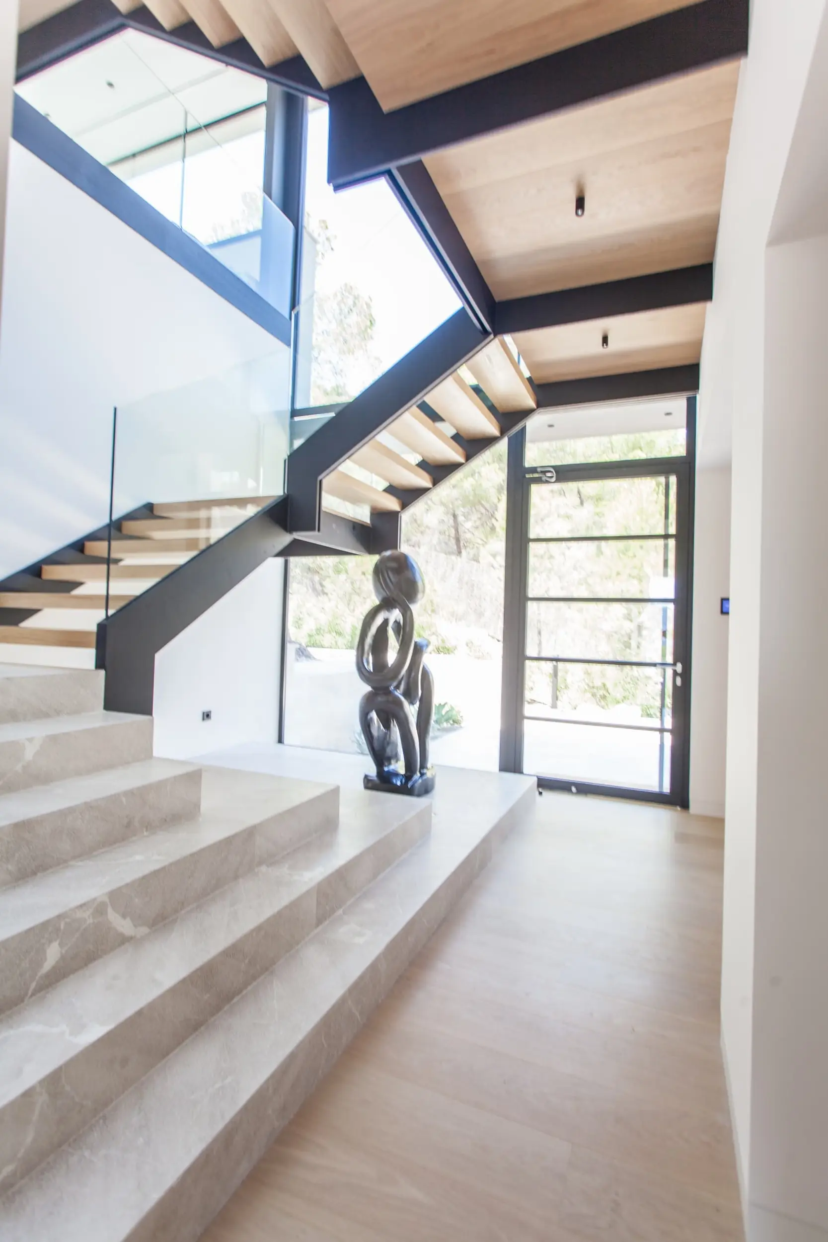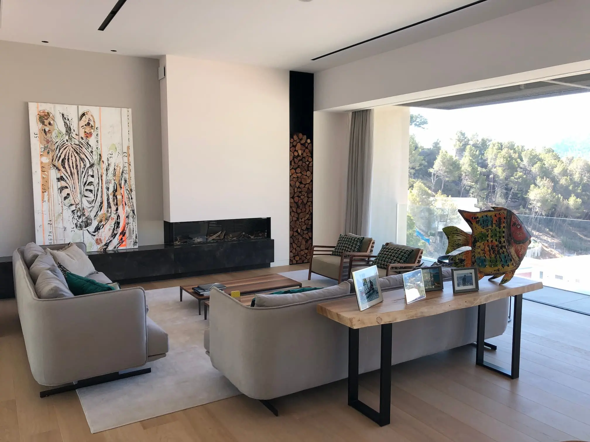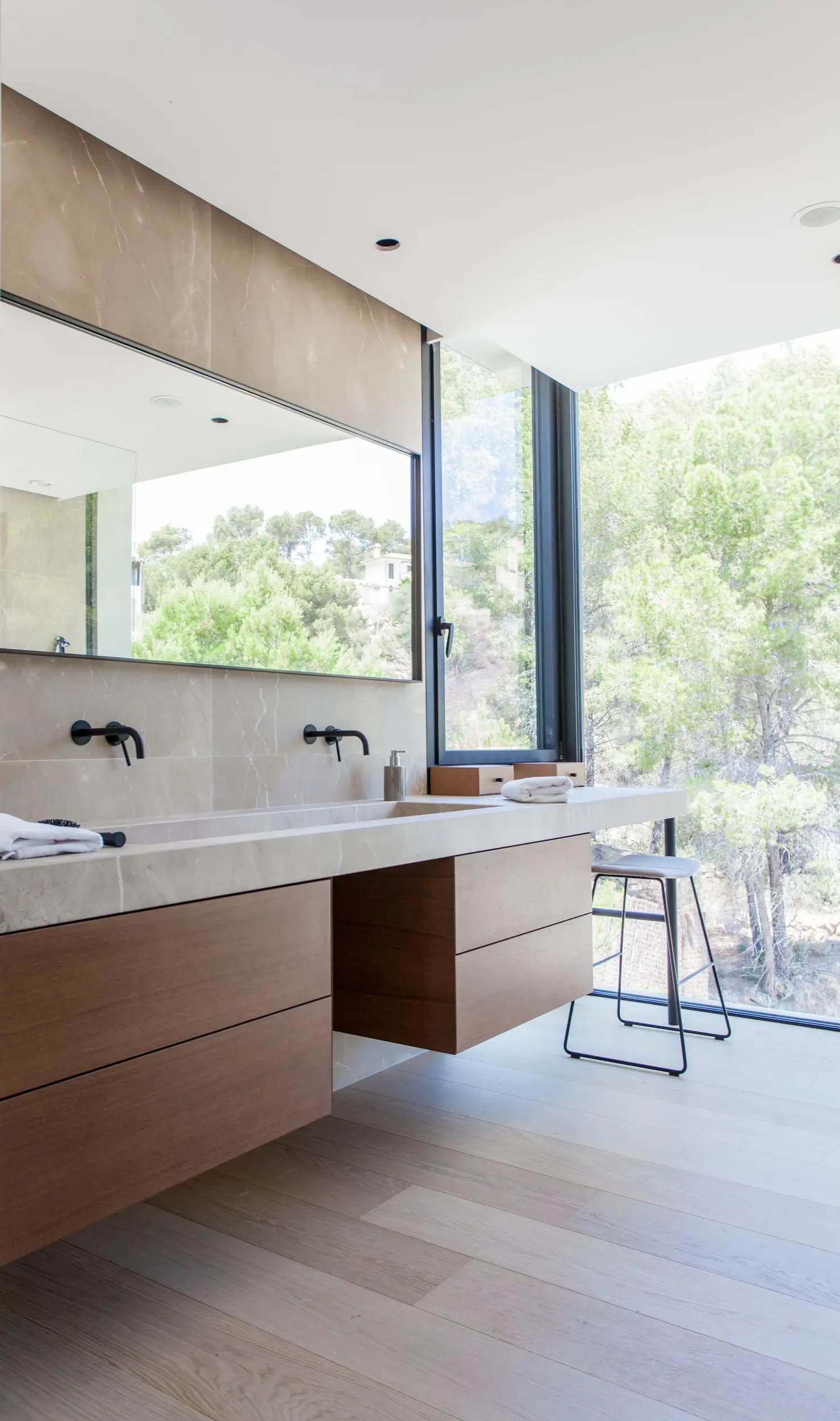 Der offene Grundriss verbindet Innen- und Außenbereiche mühelos. Große Fenster und Glasschiebetüren lassen reichlich natürliches Licht in die Räume und bieten gleichzeitig einen nahtlosen Zugang zur weitläufigen überdachten Terrasse mit angrenzender flacher Rasenzone. Hier können Sie sich in der mediterranen Sonne sonnen, am Infinity-Pool entspannen oder im Freien speisen, während Sie die spektakuläre Aussicht genießen. Die angrenzende Grünzone verleiht dem Haus zusätzliche Privatsphäre und Ruhe.