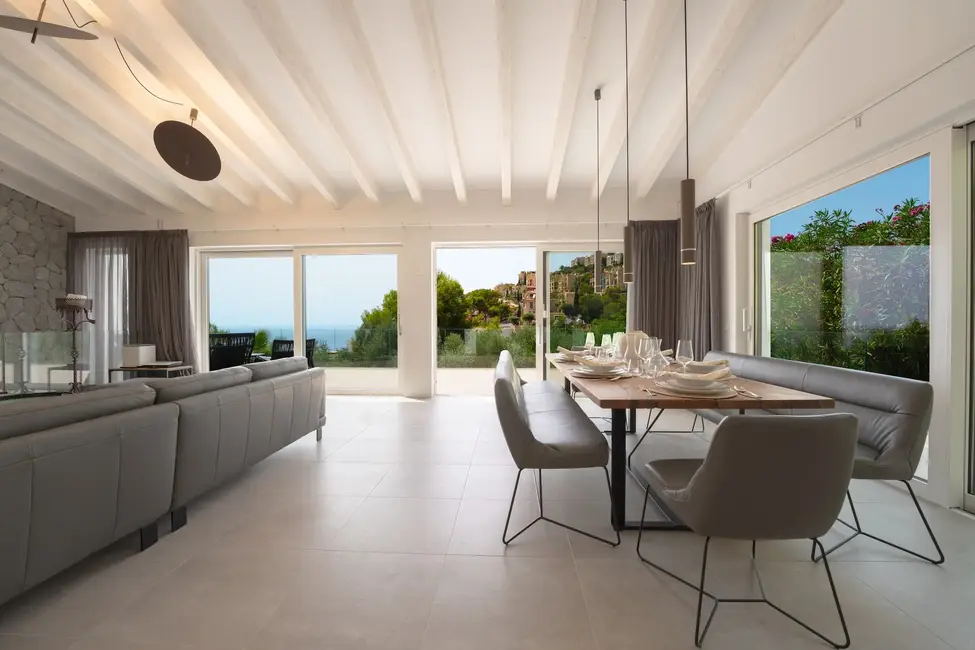 Hohe Decken, lichtdurchflutete Räume und eine offene Wohnküche verleihen dem Haus ein großzügiges und zugleich behagliches Ambiente. Von nahezu allen Bereichen – ob Wohnzimmer, Hauptschlafzimmer oder Terrasse – eröffnet sich ein traumhafter Blick auf das Meer.