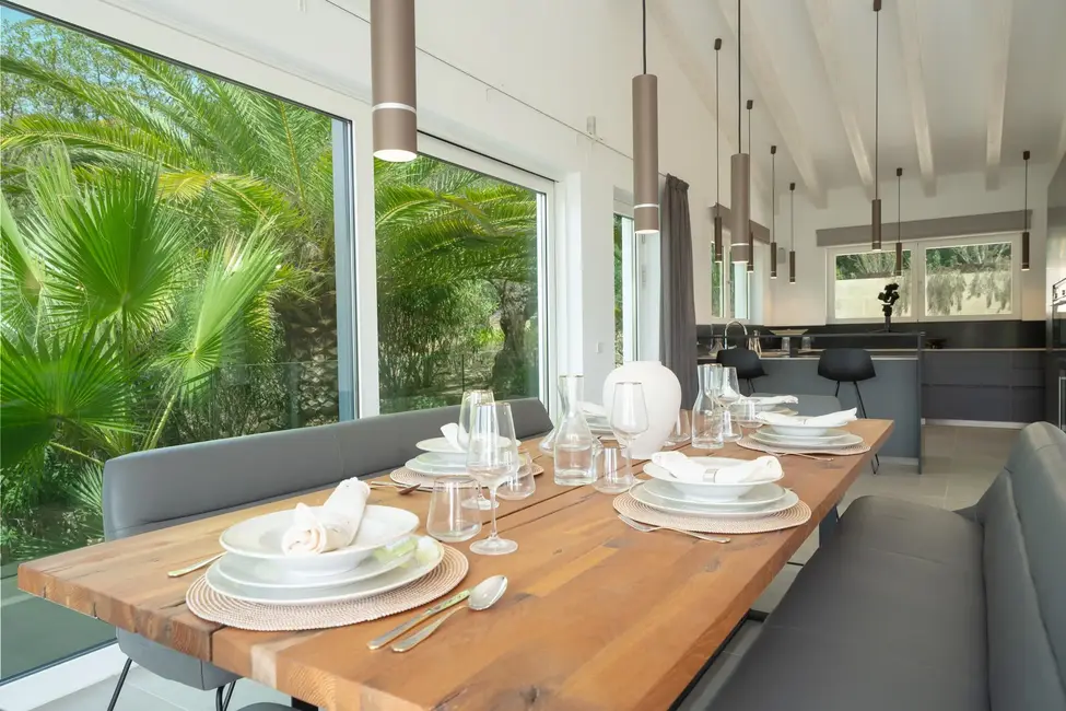 Die modernste Haustechnik, darunter ein GIRA-Domotiksystem, Fußbodenheizung per Wärmepumpe, zentrale Klimaanlage, elektrische Vorhänge sowie ein hochwertiges Sound- und Alarmsystem, sorgt für maximalen Komfort und Sicherheit.