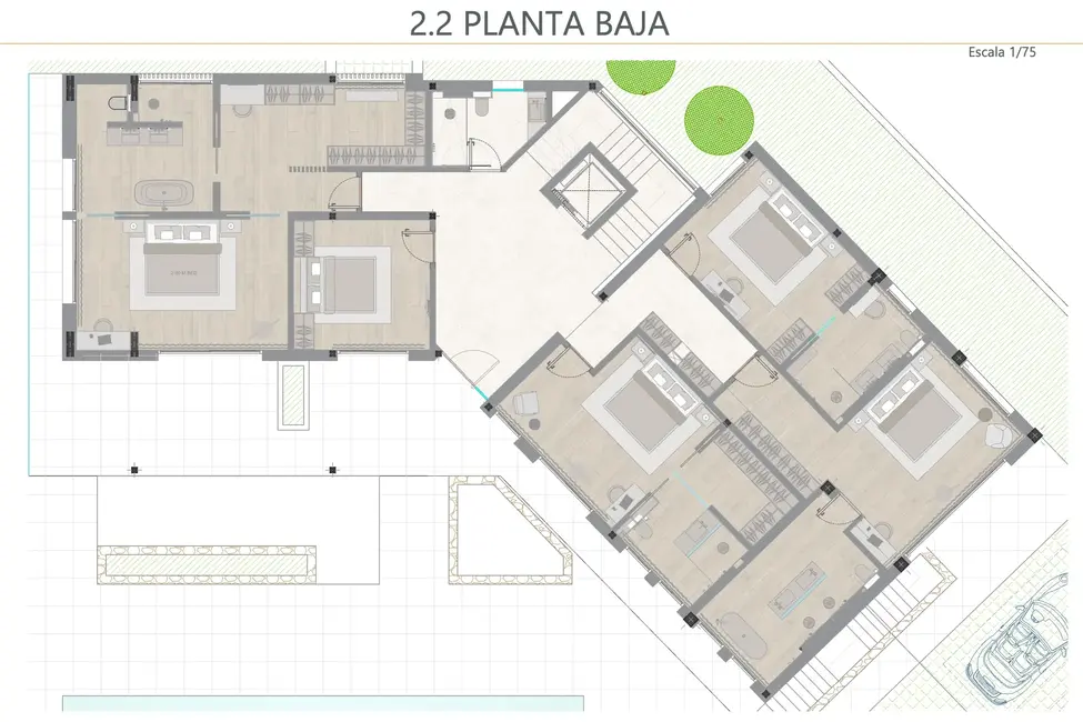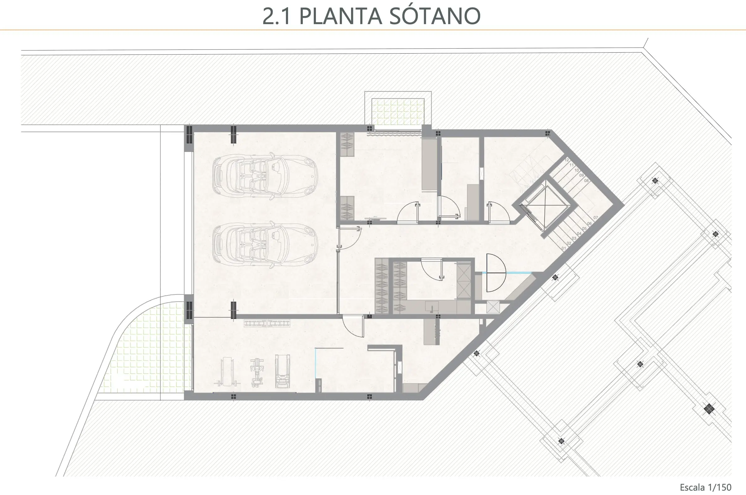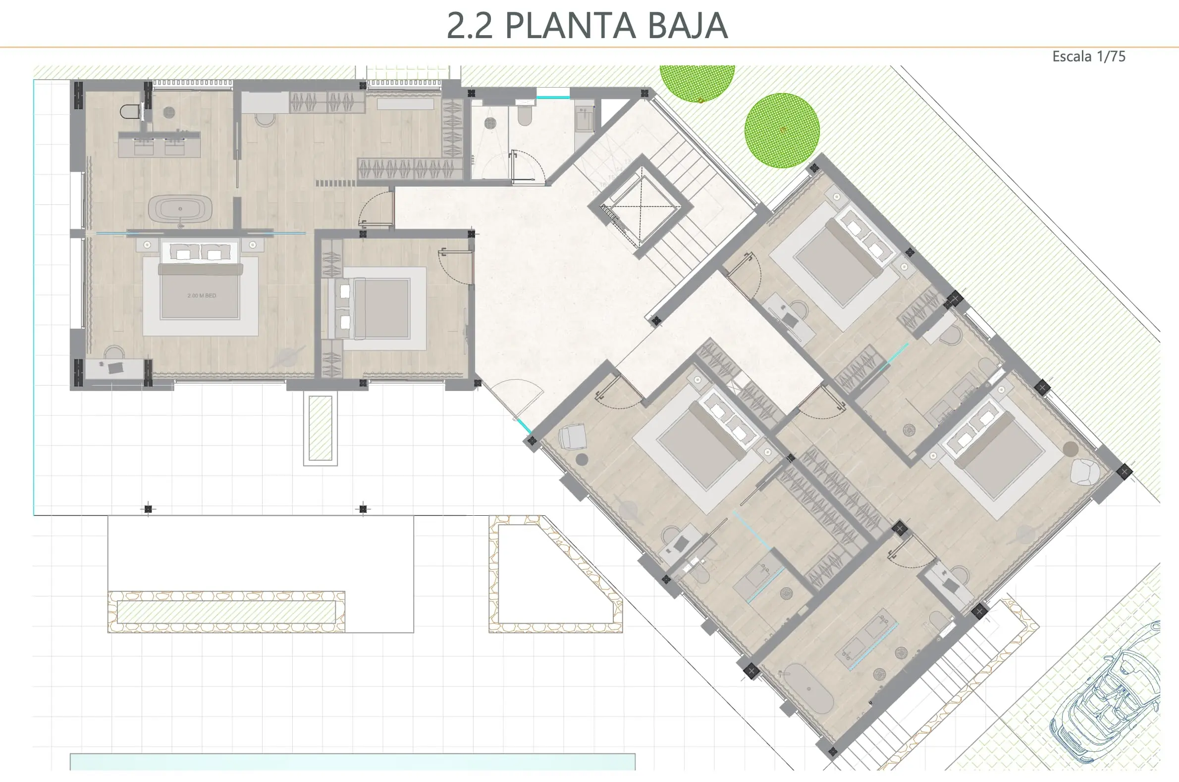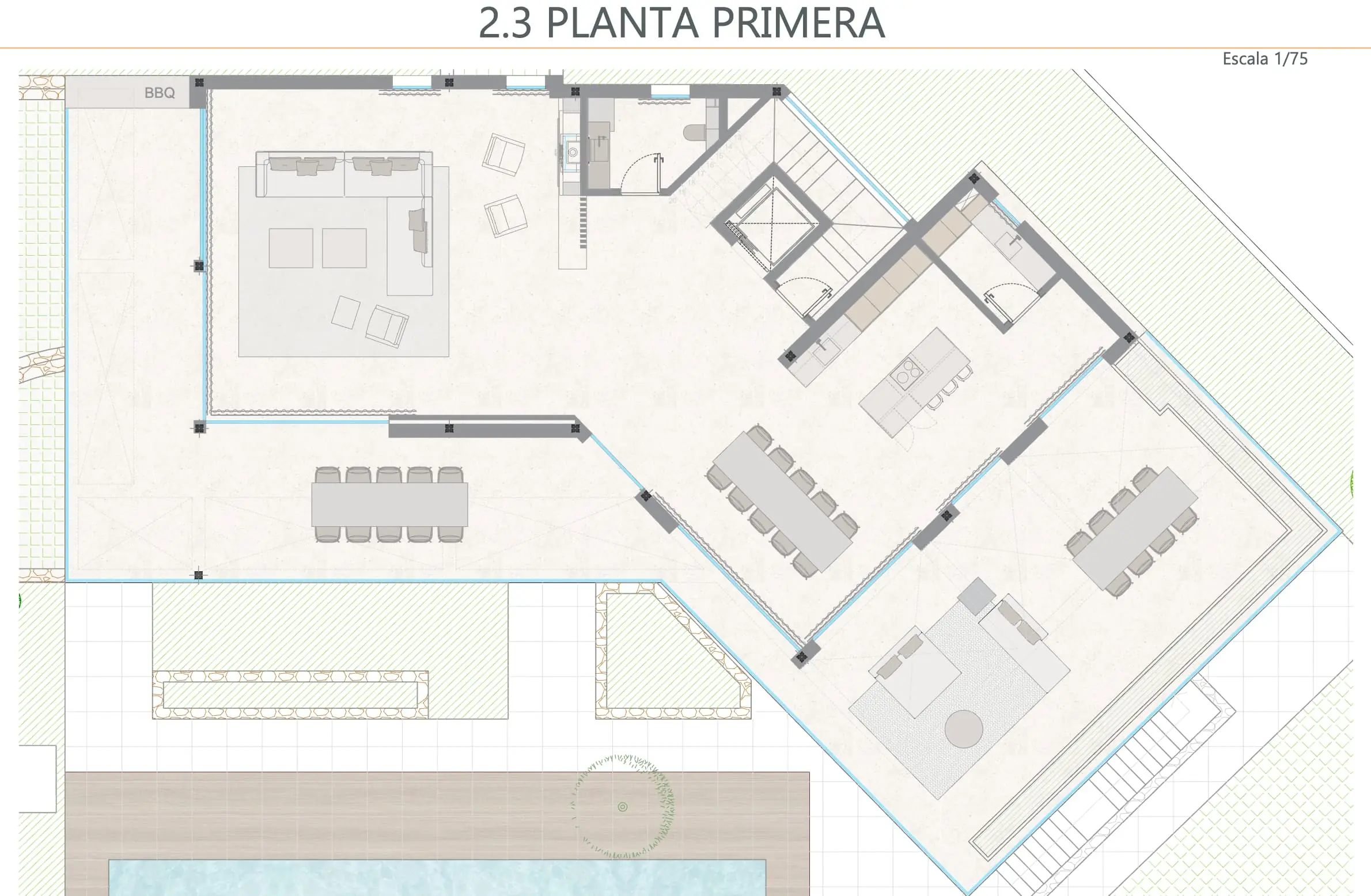 Die Villa ist auf drei Ebenen angelegt: Im Kellergeschoss befinden sich Garage, Fitnessraum, Technik- und Waschbereich; das Erdgeschoss bietet großzügige Schlafzimmer mit En-Suite-Bädern, während das Obergeschoss Wohnzimmer, offene Küche mit Essbereich und Gäste-WC beherbergt. Terrassen und Dachflächen laden zum Entspannen oder geselligen Beisammensein ein.