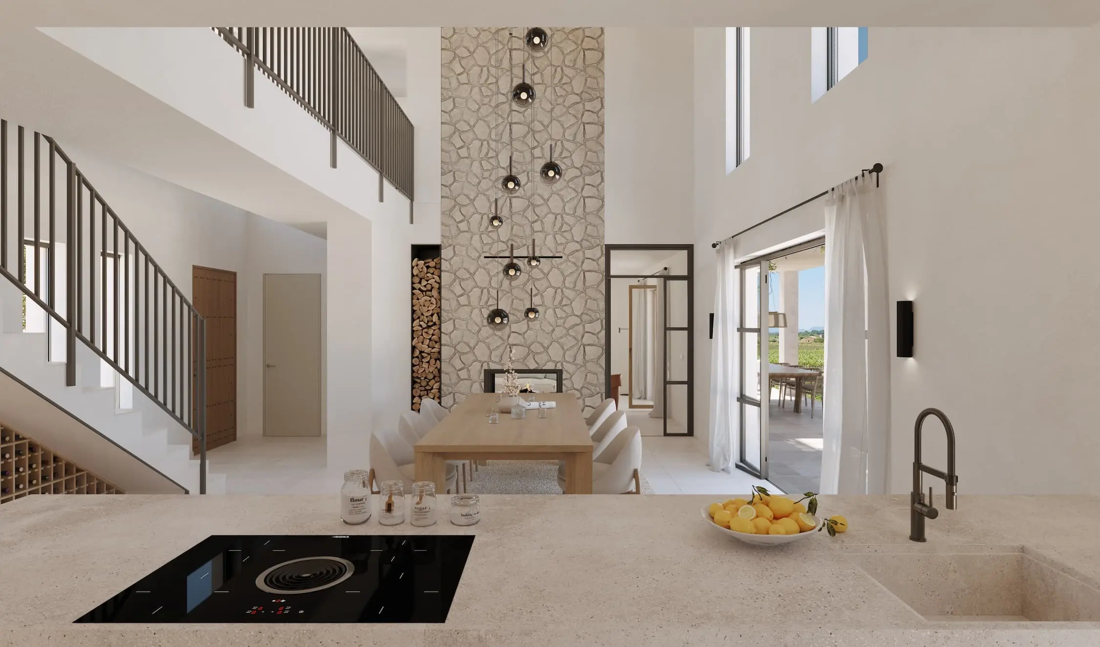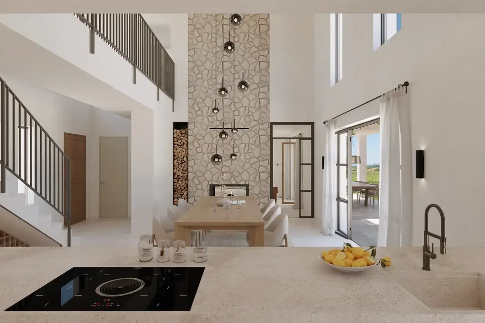 Im Inneren überzeugt die Finca mit einem offenen, lichtdurchfluteten Grundriss. Der zentrale Wohnbereich mit doppelter Raumhöhe, Galerie und imposanter Natursteinwand mit Tunnelkamin ist das Herzstück des Hauses. Eine moderne Designküche mit Miele-Geräten, großzügiger Kochinsel und angrenzender Vinothek erfüllt höchste Ansprüche an Stil und Funktion.