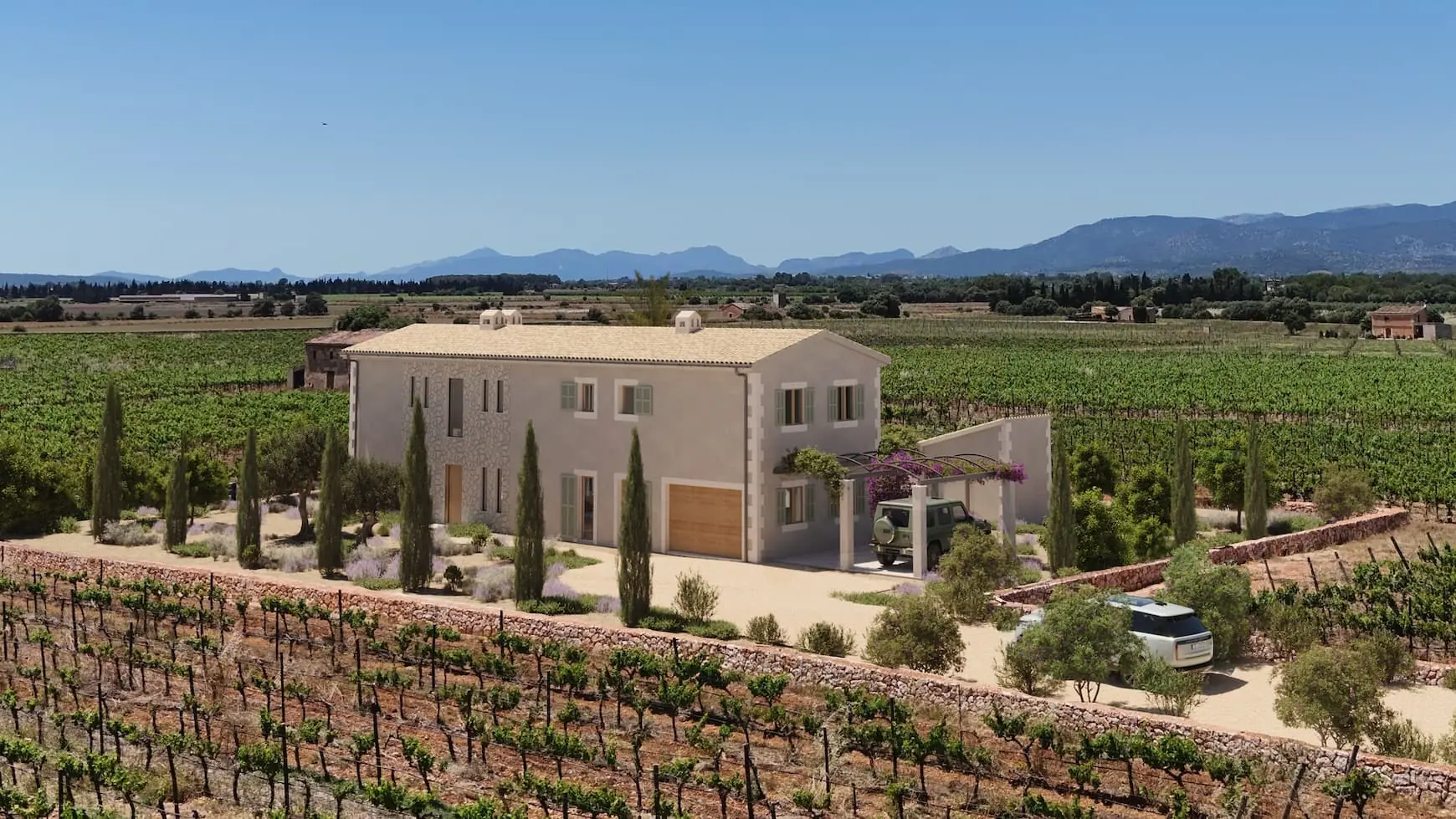 Inmitten der sanften Weinlandschaft zwischen Binissalem und Sencelles entsteht mit Sa Vinya B. ein außergewöhnliches Finca-Projekt, das moderne Architektur mit dem authentischen Charme Mallorcas vereint. Die Neubaufinca verbindet traditionelle Elemente wie Natursteinmauern und Holzbalken mit klaren Linien, großzügigen Räumen und feinster Handwerkskunst.