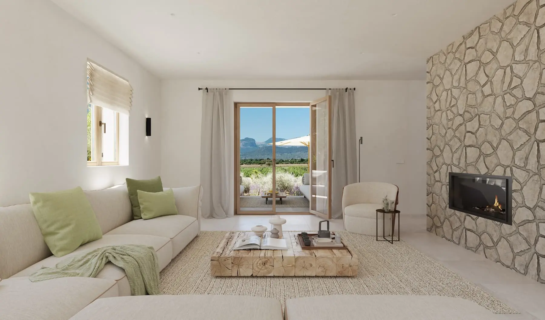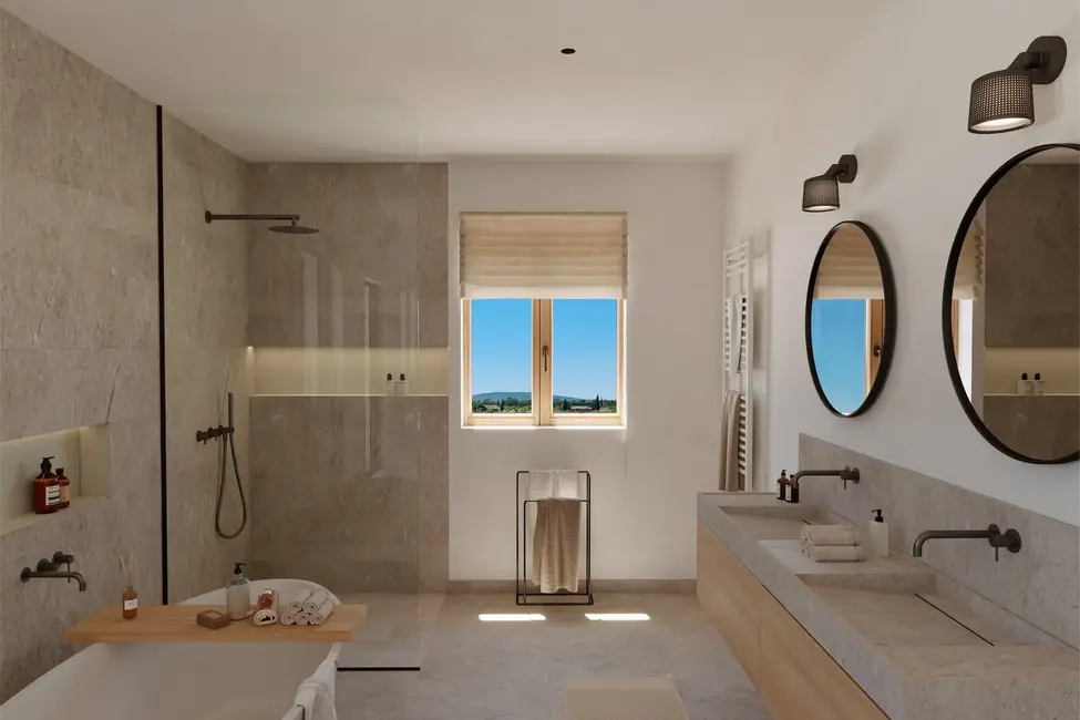 Hochwertige Materialien wie Santanyí-Naturstein, Eichenholz und edler Marmor (Gris Zarzi) prägen das elegante Interieur. Bodentiefe Fenster öffnen den Blick in die Natur und schaffen eine harmonische Verbindung zwischen Innen- und Außenbereichen.