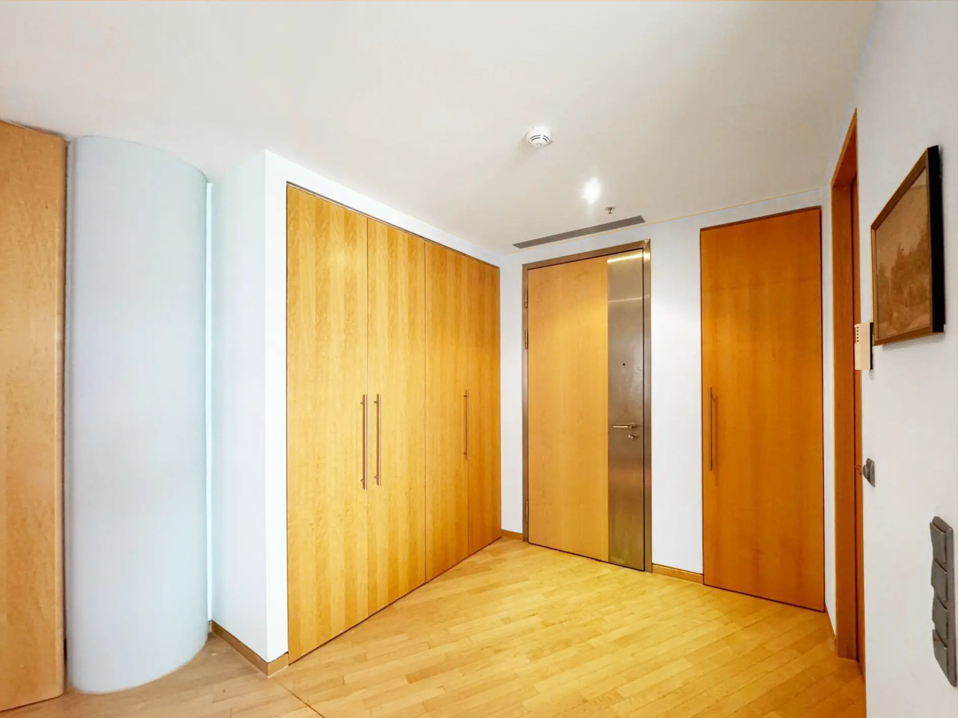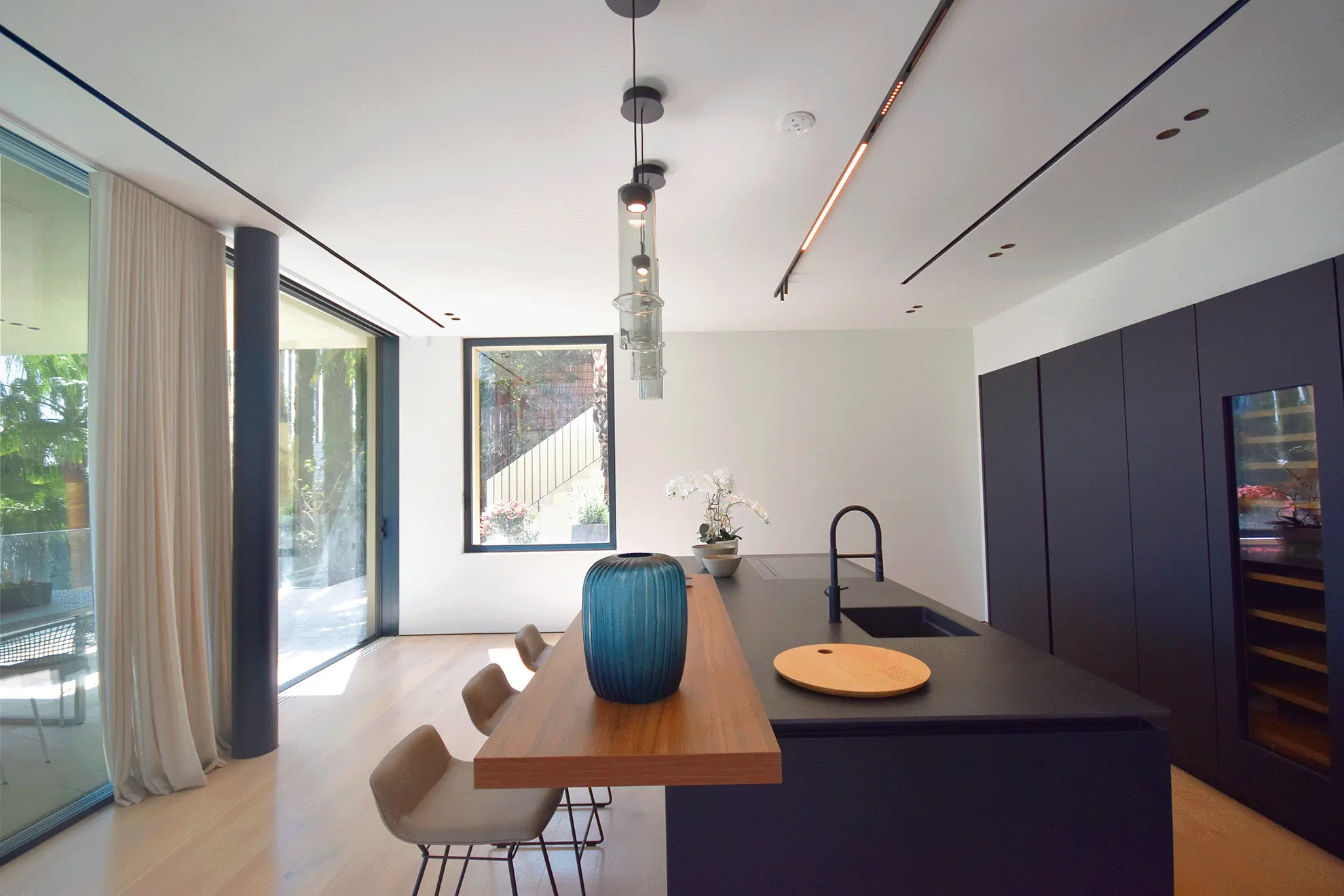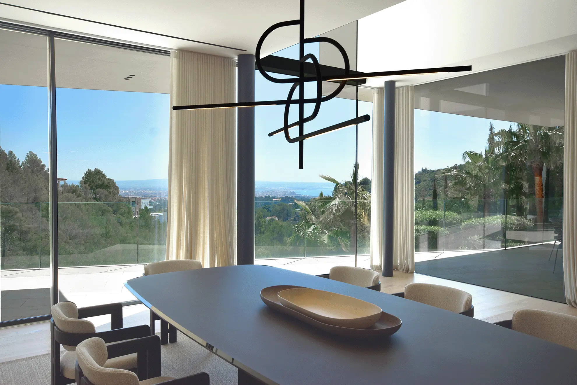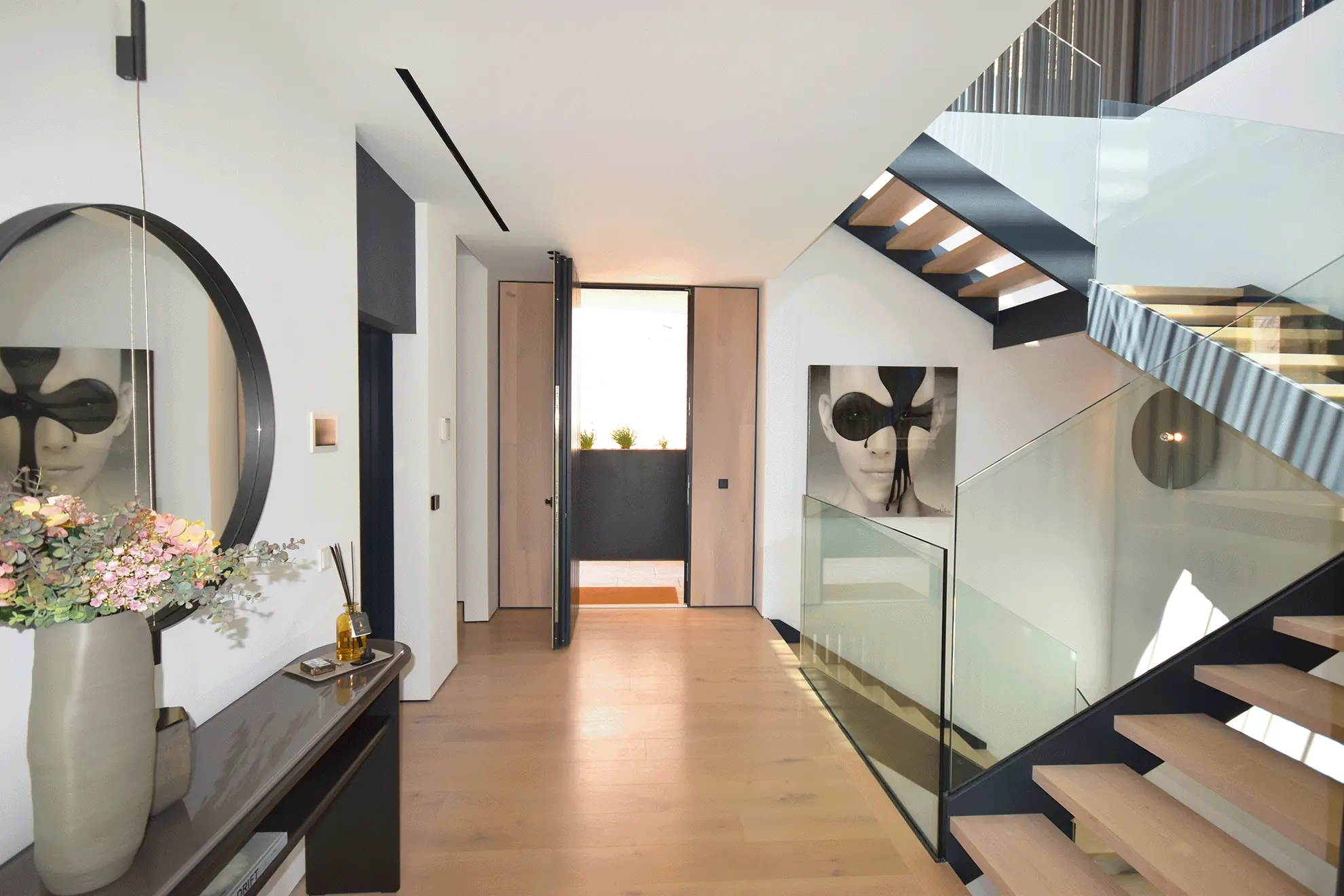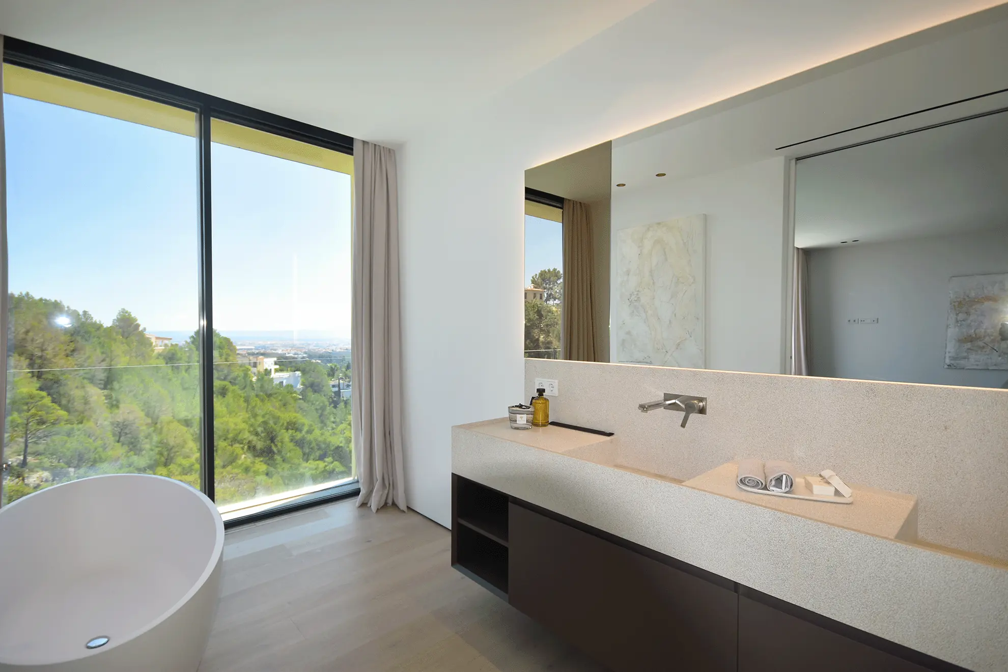 Im Obergeschoss befinden sich vier Schlafzimmer, darunter drei großzügige Doppelzimmer mit en-suite Badezimmern und Panoramablick sowie die exklusive Master-Suite. Diese bietet neben einem begehbaren Kleiderschrank ein luxuriöses Bad mit Aussicht auf die Stadt. Der Hauptwohnbereich im mittleren Stockwerk umfasst ein großzügiges Wohn- und Esszimmer mit offener Designerküche und einer angrenzenden Service-Küche sowie Waschküche. Eine weitläufige Terrasse erstreckt sich über die gesamte Hausbreite und lädt zum Verweilen ein.