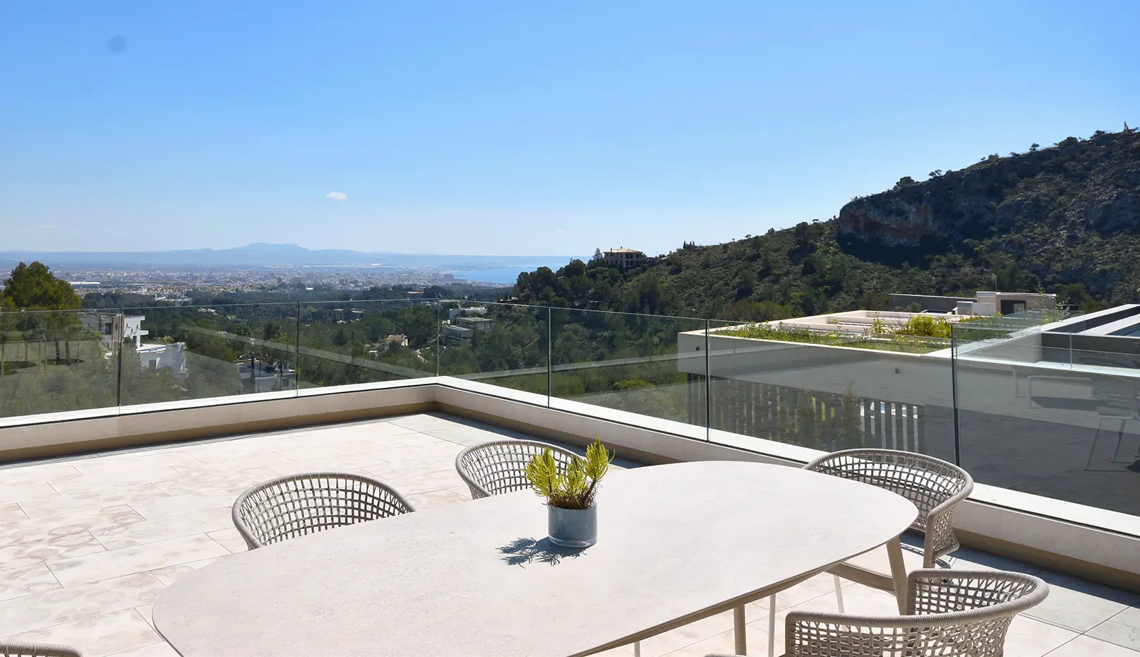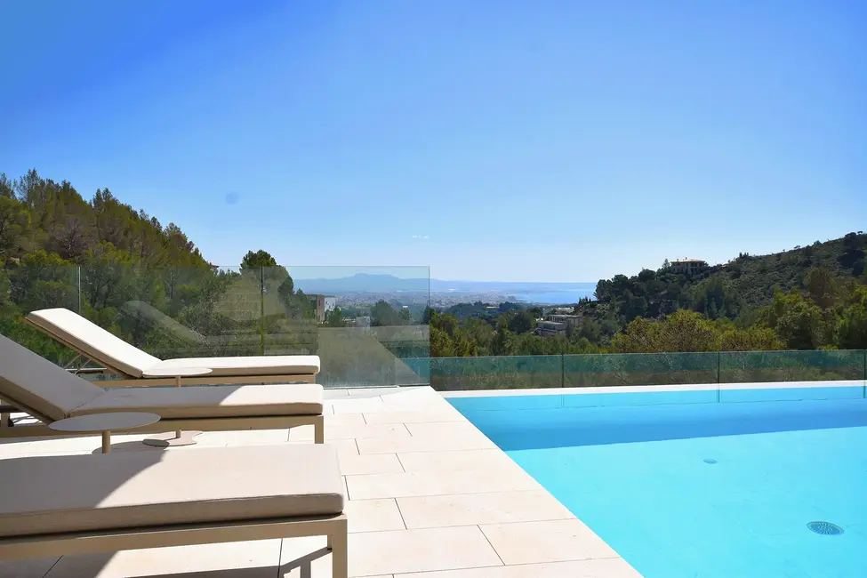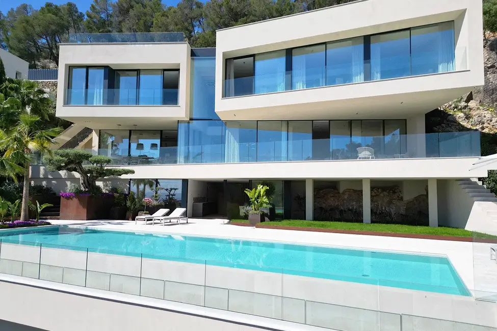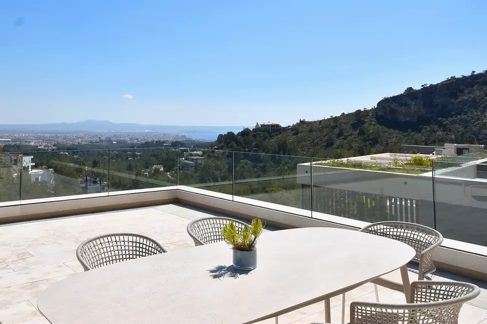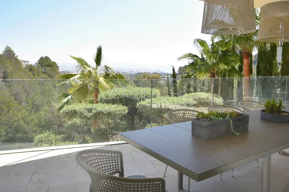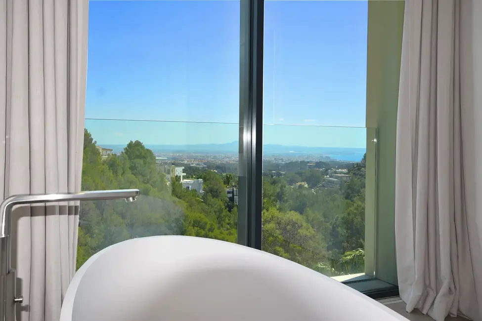 Im Untergeschoss befinden sich ein Spa-Bereich mit Sauna und ein Fitnessraum. Der 20 Meter lange Pool und die großzügige Sonnenterrasse bieten einen atemberaubenden Blick auf das Meer und die Skyline von Palma. Ein separates Gästeapartment unterhalb des Pools, ausgestattet mit Schlafzimmer, Bad und Küche, bietet zusätzlichen Komfort. Die Dachterrasse, ausgestattet mit einer Pergola, ist ein idealer Ort zum Entspannen. Eine Garage für zwei Autos und eine umfassende Sicherheitsausstattung vervollständigen das luxuriöse Angebot.