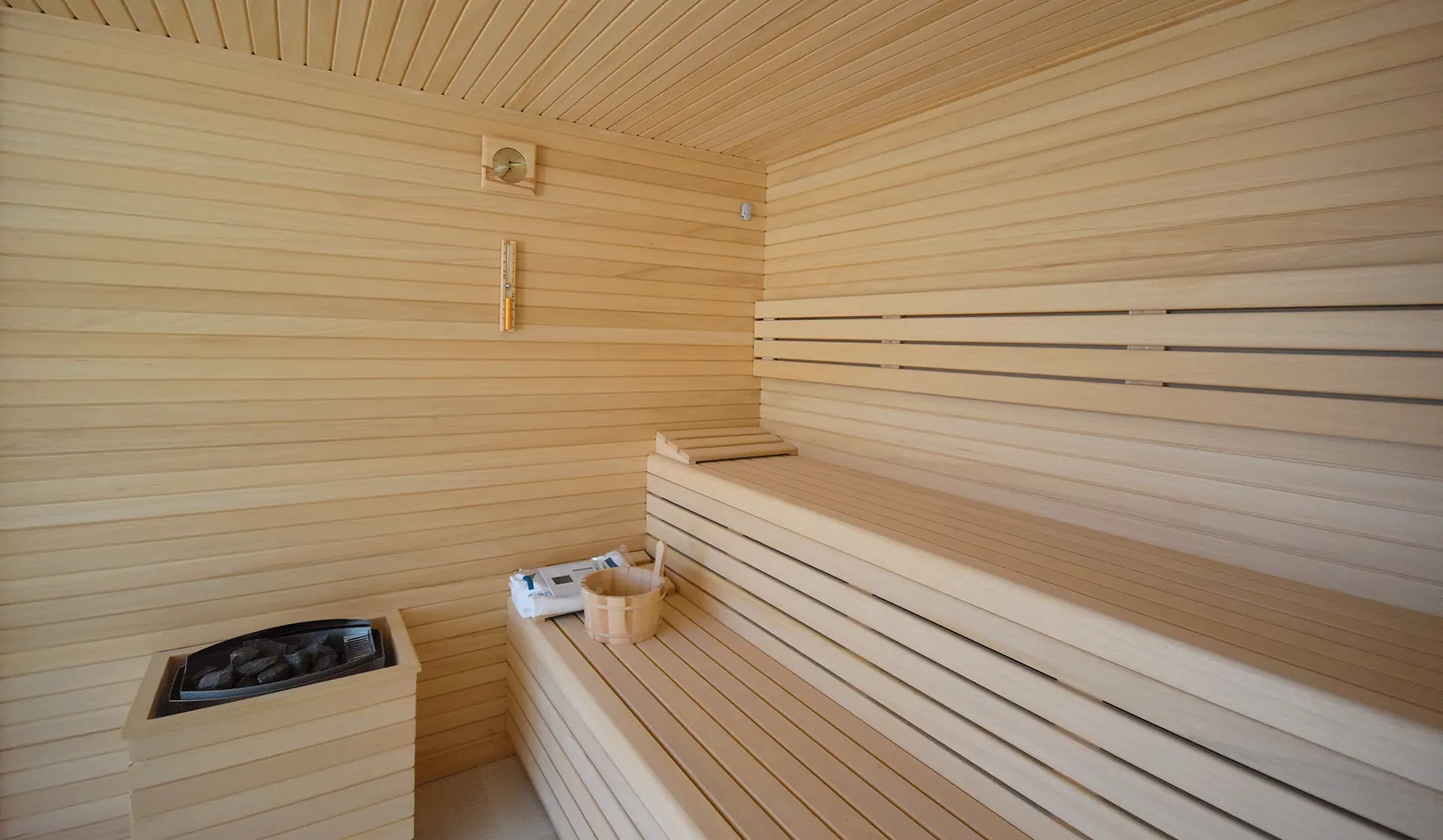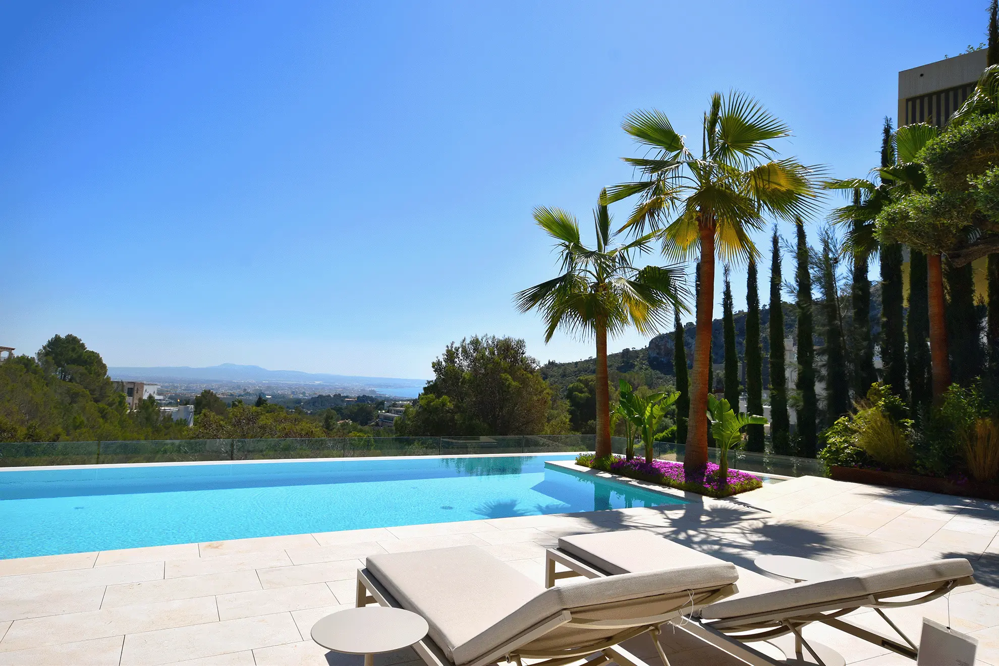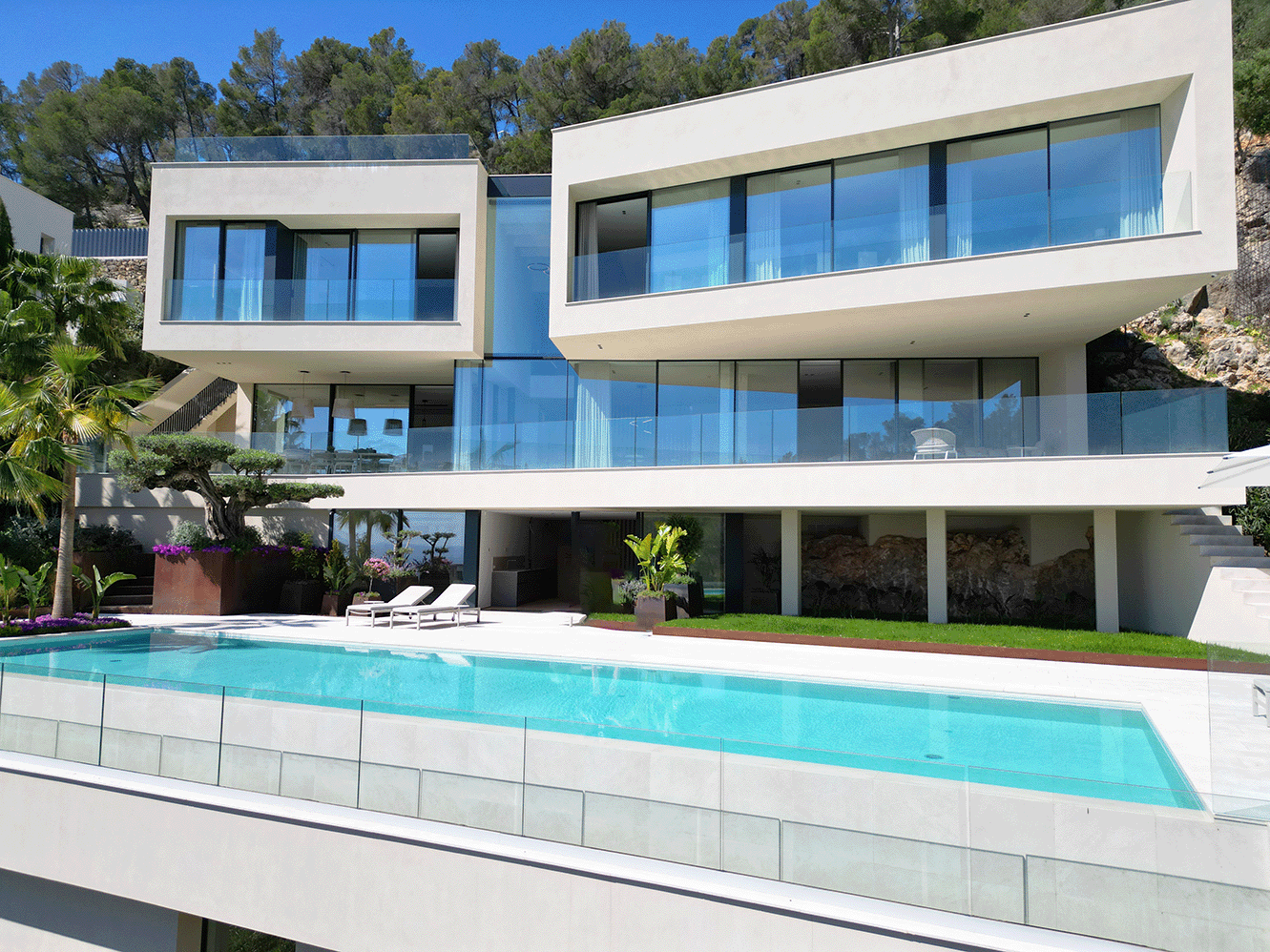 Im Untergeschoss befinden sich ein Spa-Bereich mit Sauna und ein Fitnessraum. Der 20 Meter lange Pool und die großzügige Sonnenterrasse bieten einen atemberaubenden Blick auf das Meer und die Skyline von Palma. Ein separates Gästeapartment unterhalb des Pools, ausgestattet mit Schlafzimmer, Bad und Küche, bietet zusätzlichen Komfort. Die Dachterrasse, ausgestattet mit einer Pergola, ist ein idealer Ort zum Entspannen. Eine Garage für zwei Autos und eine umfassende Sicherheitsausstattung vervollständigen das luxuriöse Angebot.