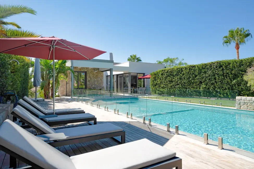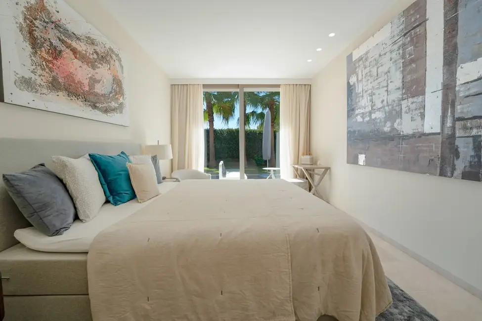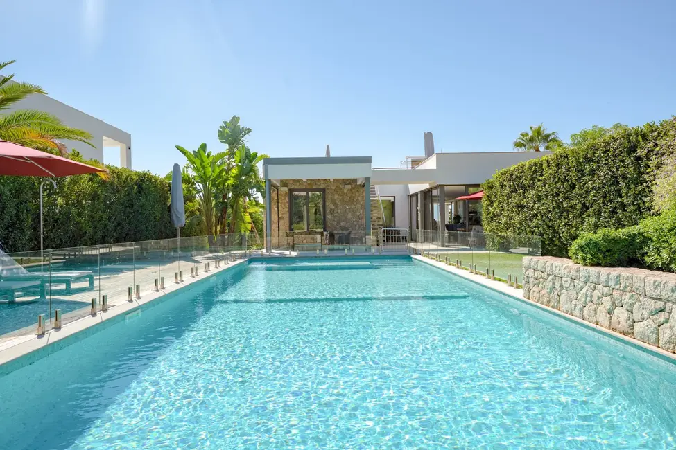 Das Erdgeschoss beherbergt drei Schlafzimmer mit Bad en Suite, einen Hauswirtschaftsraum sowie den direkten Zugang zum Poolbereich mit weitläufiger Sonnenterrasse und einem traumhaft angelegten Garten.